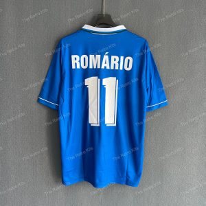 The 1996 Brazil away shirt featured a classic blue design with white collar and trim, complemented by subtle tonal patterns across the fabric and the CBF crest on the chest. Paired with white shorts and blue socks, this kit was worn by stars such as Ronaldo, Rivaldo, and Cafu during the 1996 Olympic Games in Atlanta and in various friendlies leading up to the 1998 World Cup cycle. The clean look carried forward Brazil’s long tradition of striking blue away shirts.