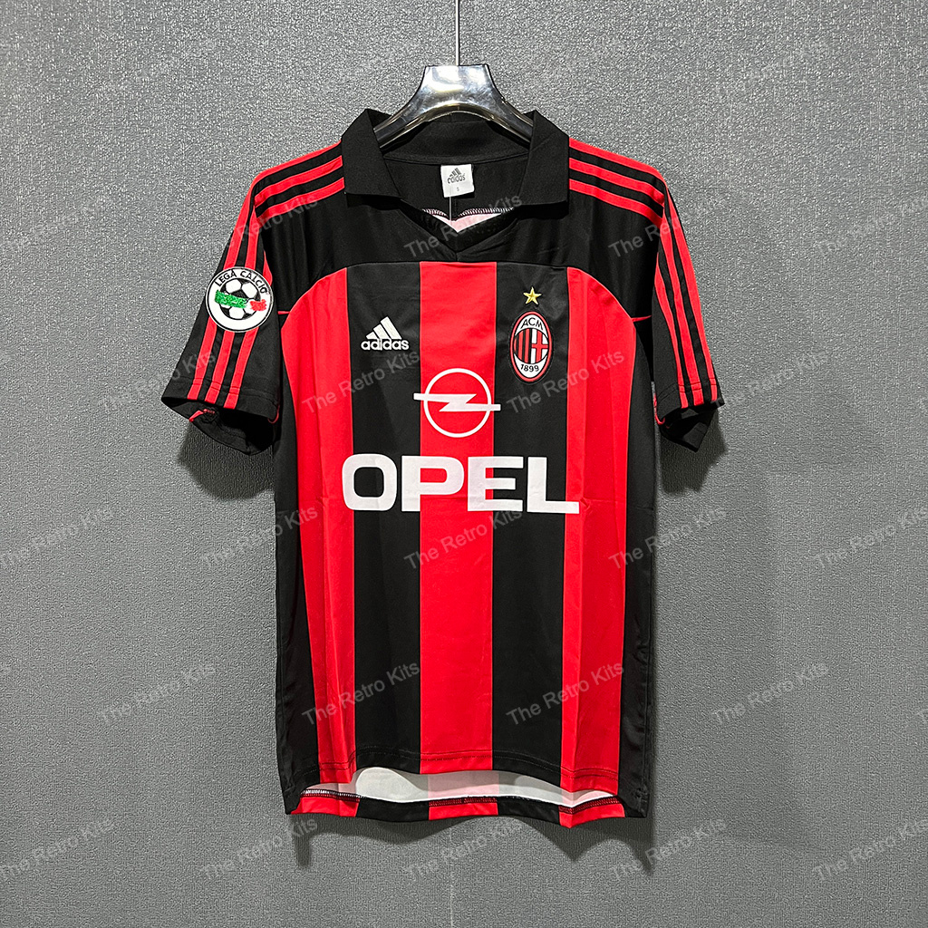 The 2000–02 AC Milan home shirt featured the club’s iconic red and black vertical stripes, paired with black shorts and black socks. It displayed the Opel sponsor across the chest alongside the club crest, maintaining the classic Rossoneri identity. This kit was worn by legends such as Paolo Maldini, Andriy Shevchenko, and Rui Costa during Serie A and Champions League campaigns. Although the period was challenging domestically, the shirt remains a fan favourite, remembered for Shevchenko’s goals and Maldini’s leadership.