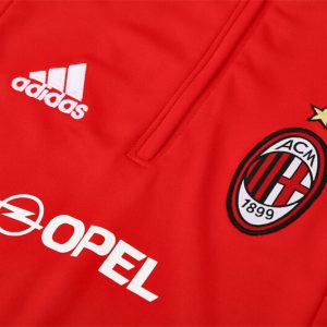 The 2004/05 AC Milan red training suit featured a bold red top with black and white detailing on the sleeves and shoulders, paired with matching red pants. It carried the Opel sponsor across the chest and the club crest, underlining Milan’s Rossoneri identity. Worn by stars such as Paolo Maldini, Andriy Shevchenko, and Kaká, this training outfit was part of the team’s preparation during a season remembered for reaching the 2005 UEFA Champions League Final in Istanbul.