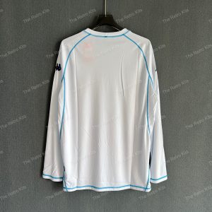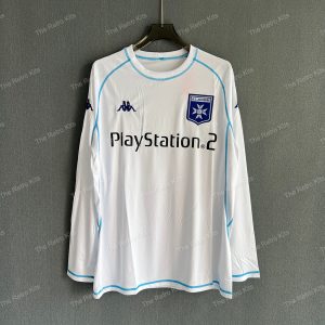 The 2003/04 AJ Auxerre long sleeve home shirt featured a classic white design with blue detailing on the collar, cuffs, and shoulders, paired with white shorts and socks. It carried the PlayStation 2 sponsor across the chest alongside the club crest, giving it a clean yet modern early-2000s look. Worn by players such as Djibril Cissé, Philippe Mexès, and Bonaventure Kalou, this kit is remembered from the season when Auxerre competed in Ligue 1 and the UEFA Cup, showcasing one of the most talented squads in the club’s history.