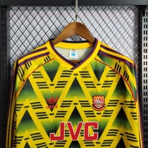 The 1991–93 Arsenal away shirt featured the club’s legendary “bruised banana” design, with a bold yellow base covered in jagged black geometric patterns and finished with red trim on the collar and cuffs. It carried the JVC sponsor across the chest and was paired with yellow shorts and socks. Worn by stars such as Ian Wright, Tony Adams, and Paul Merson, this kit has become one of the most iconic and collectible shirts in Premier League history, symbolising early 1990s football culture.