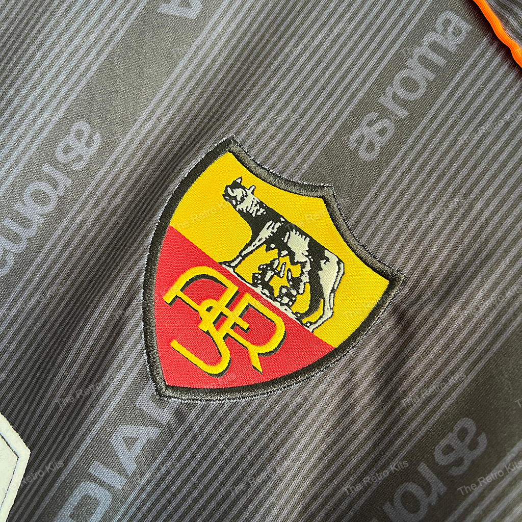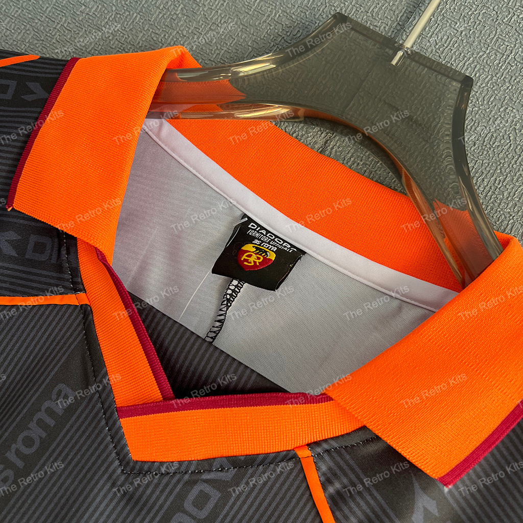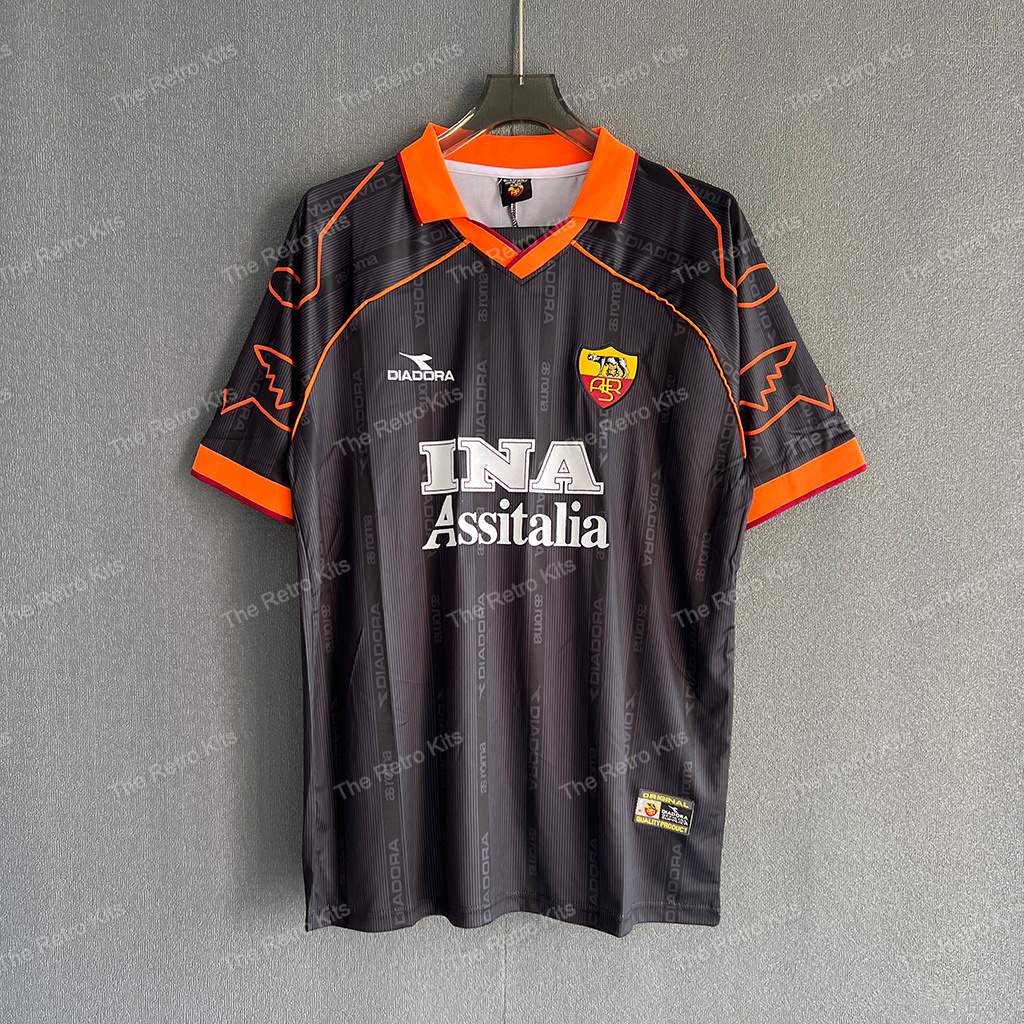 The 1999/2000 AS Roma third shirt featured a black base with striking orange details on the collar, cuffs, and shoulders, paired with black shorts and socks for a bold, modern look. It carried the INA Assitalia sponsor across the chest alongside the club crest, creating a perfect balance of simplicity and power. Worn by icons such as Francesco Totti, Vincenzo Montella, and Cafu, this kit became a standout from the late ’90s era — a symbol of Roma’s growing ambition and unmistakable style.