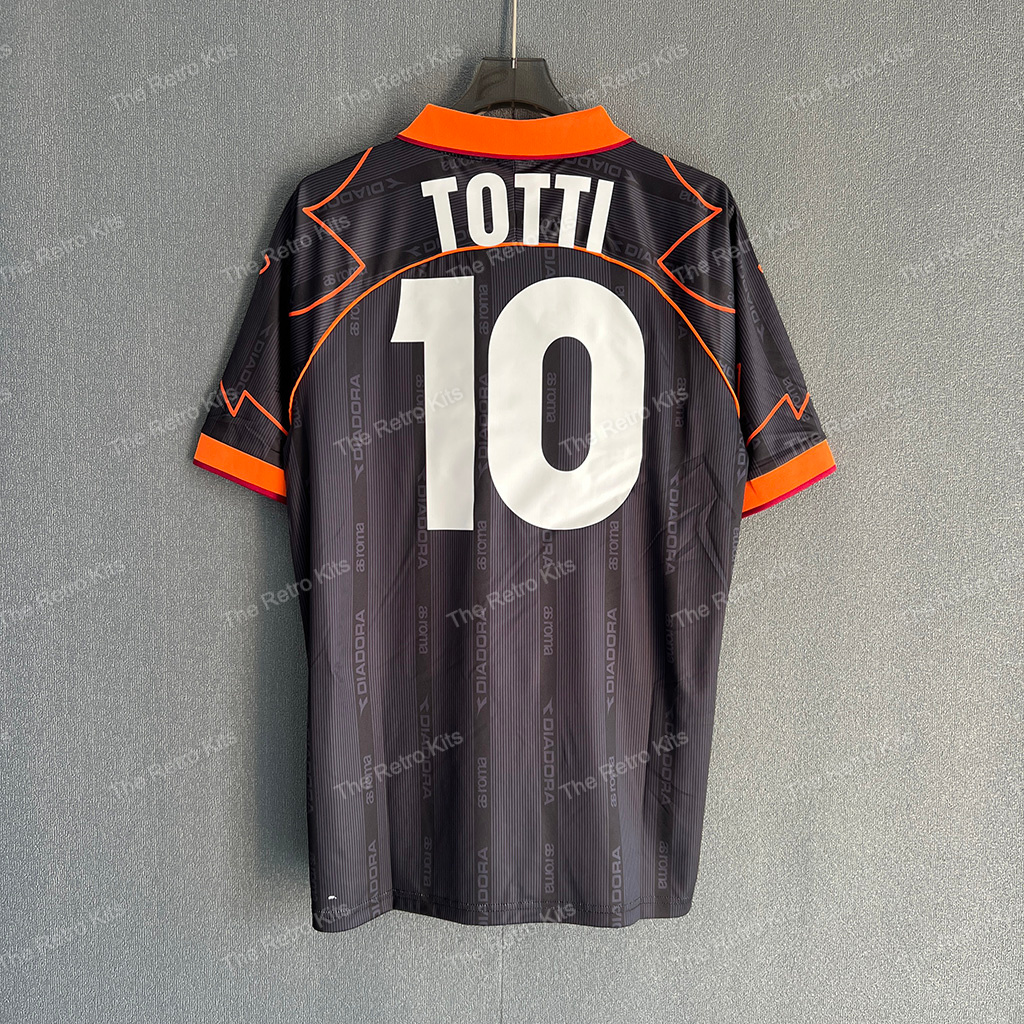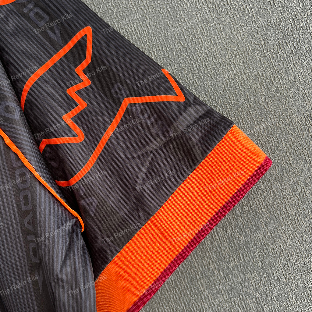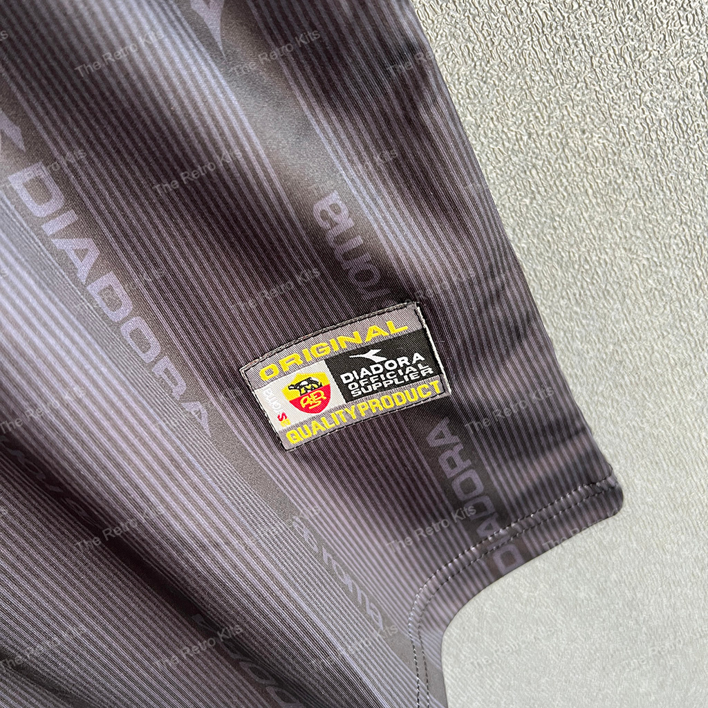 The 1999/2000 AS Roma third shirt featured a black base with striking orange details on the collar, cuffs, and shoulders, paired with black shorts and socks for a bold, modern look. It carried the INA Assitalia sponsor across the chest alongside the club crest, creating a perfect balance of simplicity and power. Worn by icons such as Francesco Totti, Vincenzo Montella, and Cafu, this kit became a standout from the late ’90s era — a symbol of Roma’s growing ambition and unmistakable style.