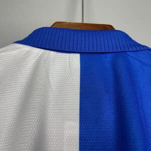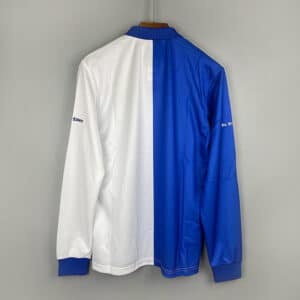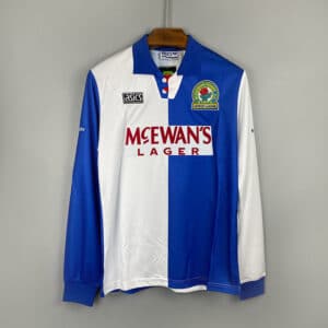 The 1994/95 Blackburn Rovers home shirt featured the club’s iconic blue and white halves, proudly displaying the McEwan’s Lager sponsor across the chest. Worn by stars such as Alan Shearer, Chris Sutton, and Tim Flowers, this kit became legendary as Blackburn were crowned Premier League champions, securing their first top-flight league title since 1914.