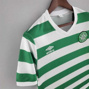 The 1979/82 Celtic home shirt featured the club’s iconic green and white hoops with a traditional v-neck collar, paired with white shorts and green socks. It carried no sponsor, preserving a pure and traditional football aesthetic. Worn by legends such as Danny McGrain, Roy Aitken, and Charlie Nicholas, this kit became symbolic of Celtic’s 1980 Scottish Cup triumph and their classic footballing heritage of the early 1980s.