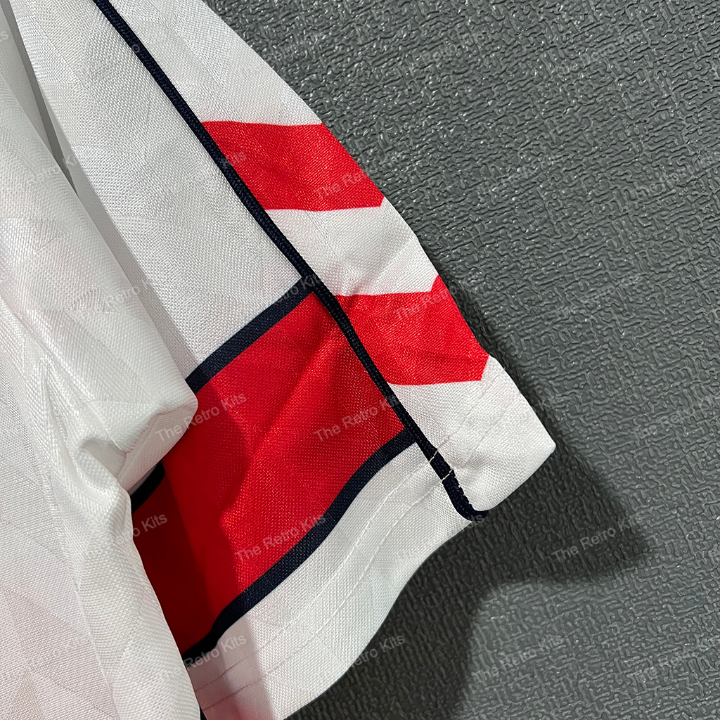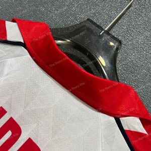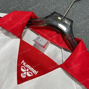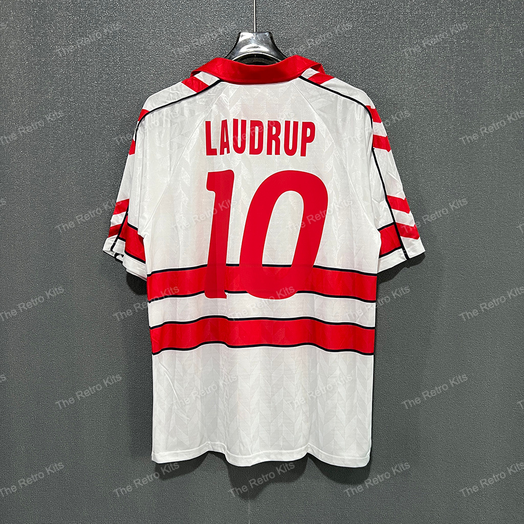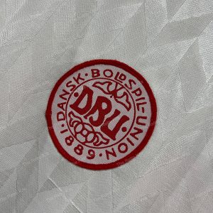The 1988 Denmark away shirt presented a white base with red pinstripes, paired with red shorts and white socks. Like the home version, it carried the bold Hummel chevrons. This shirt was part of Denmark’s Euro 1988 campaign, remembered for its stylish look despite a group-stage exit.
