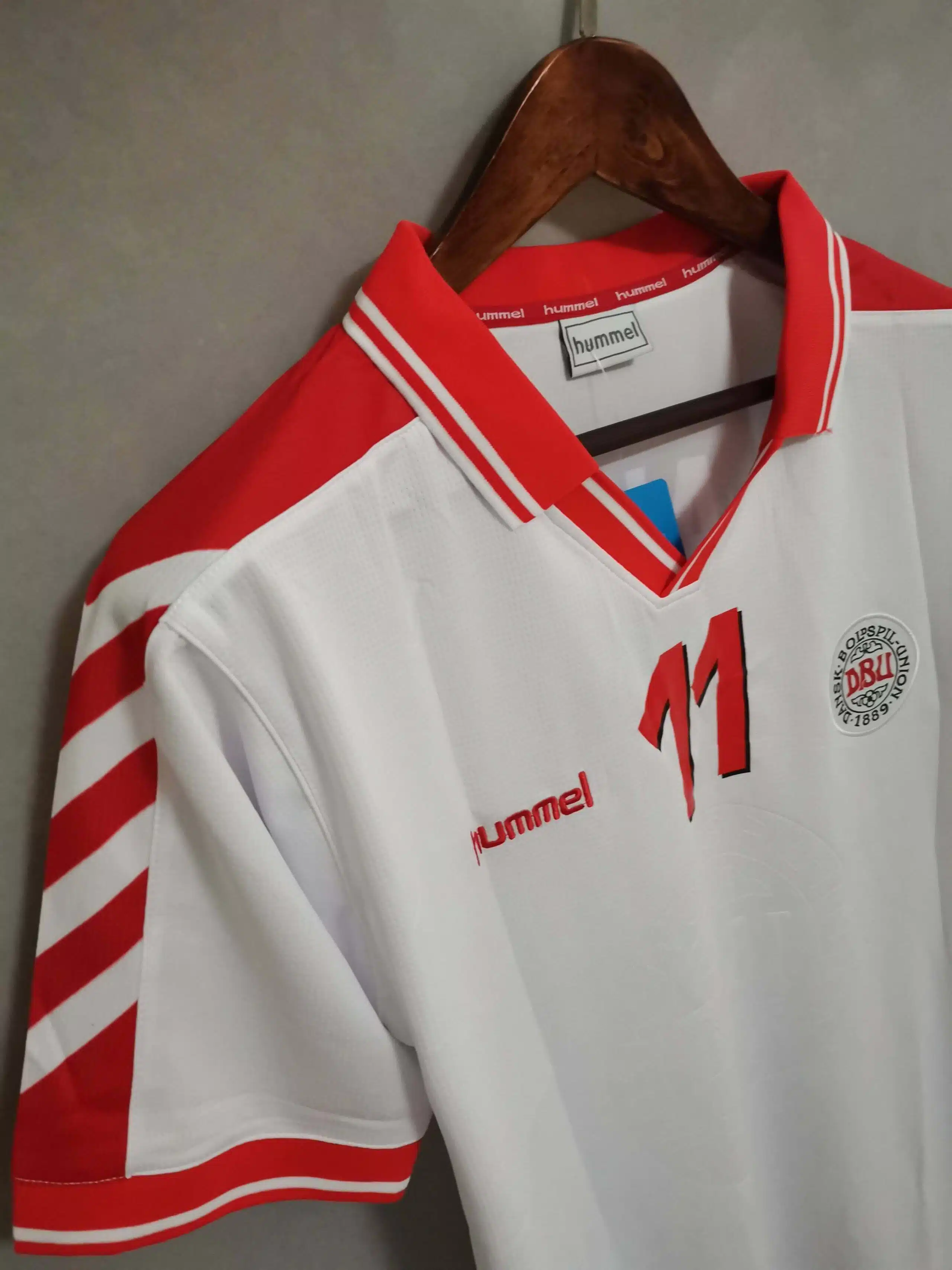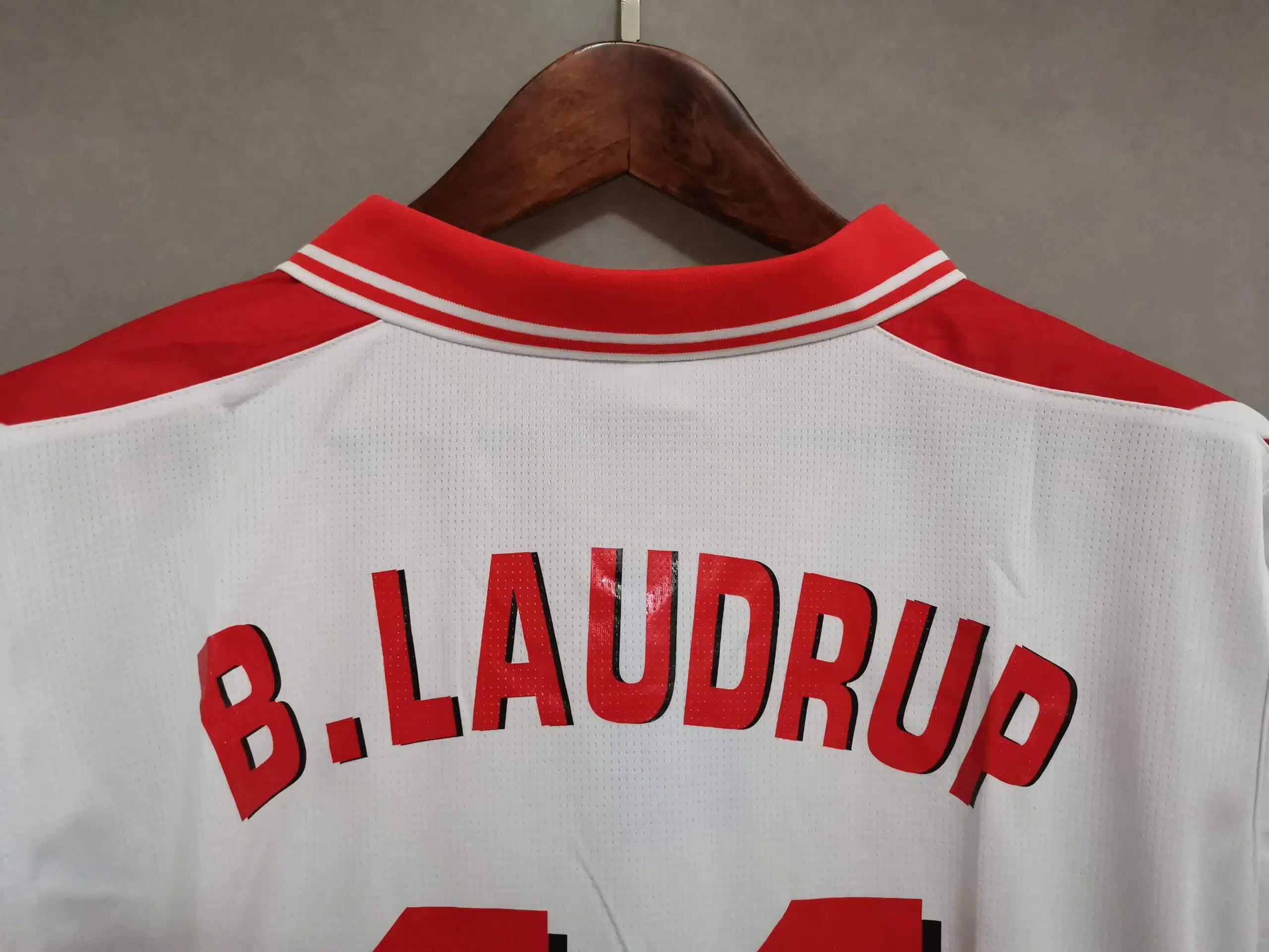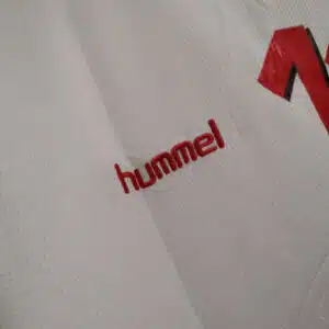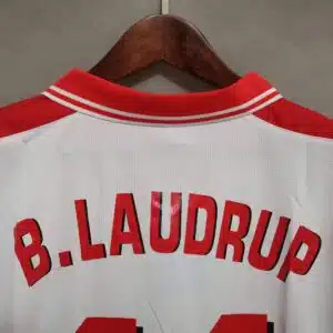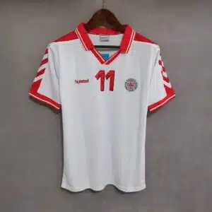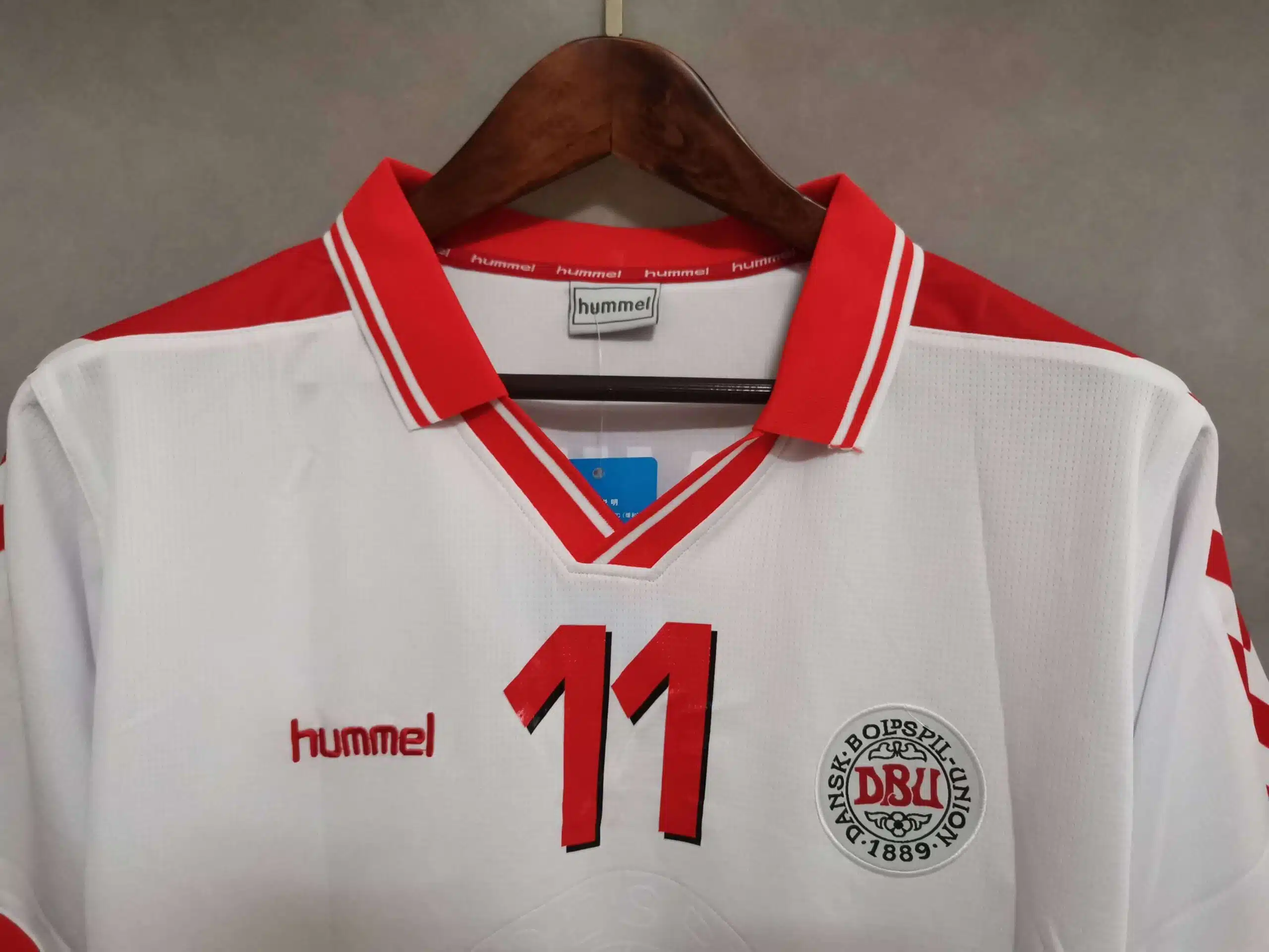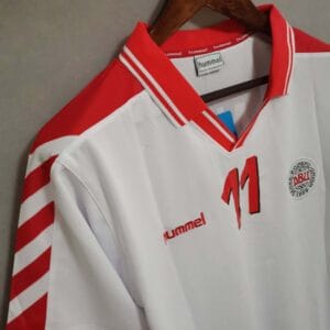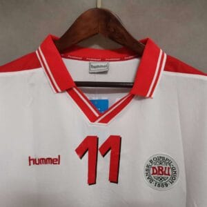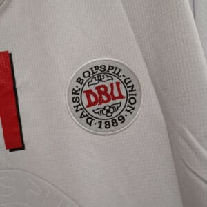 The 1998 Denmark away shirt presented a clean white base with red details on the shoulders and collar, paired with white shorts and socks. It carried the same modern Hummel design as the home version. This kit was worn during the 1998 World Cup, including the memorable 4–1 win over Nigeria in the Round of 16.