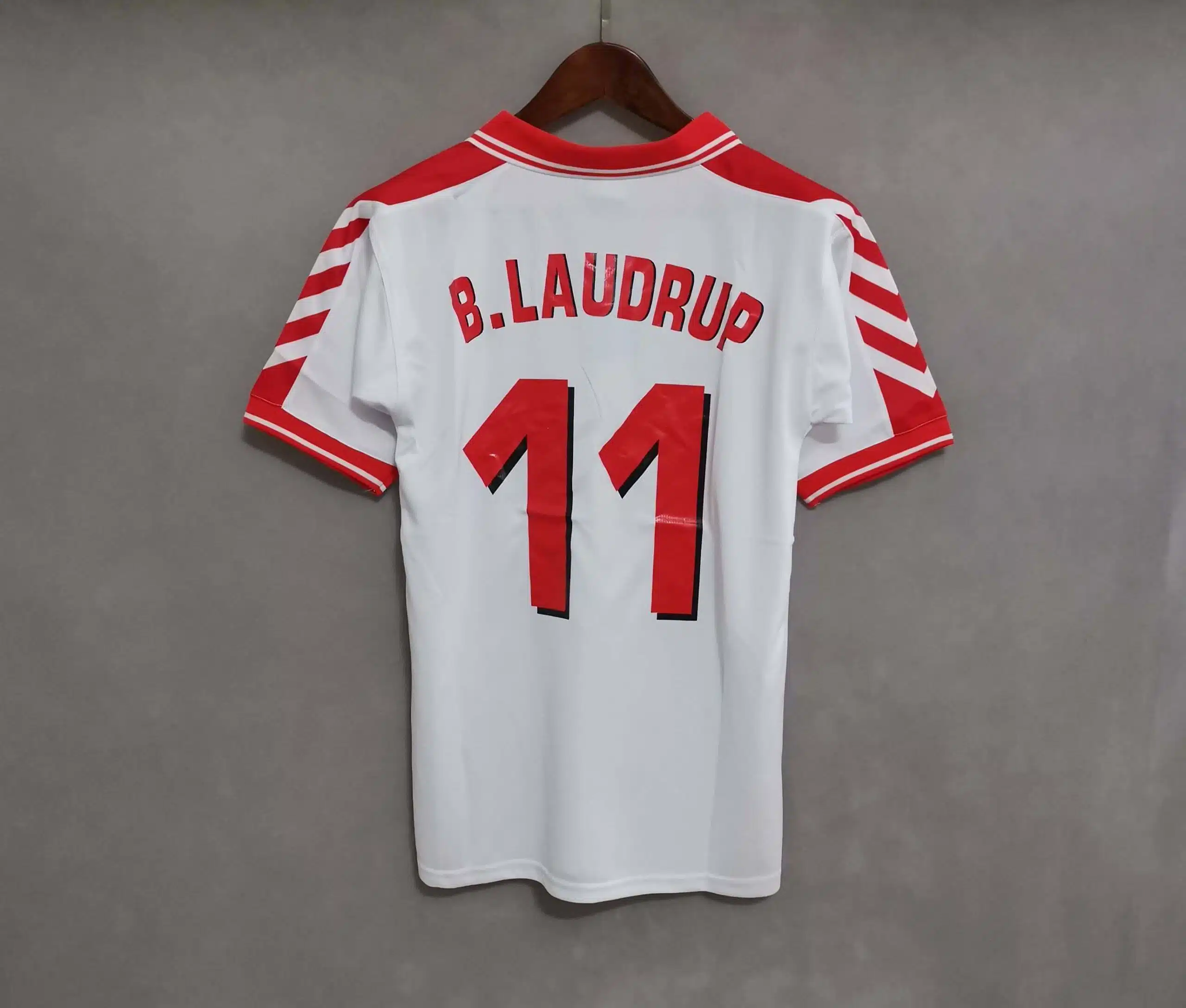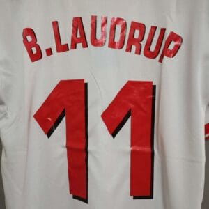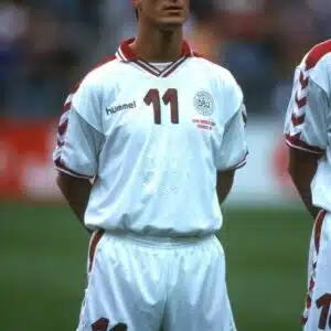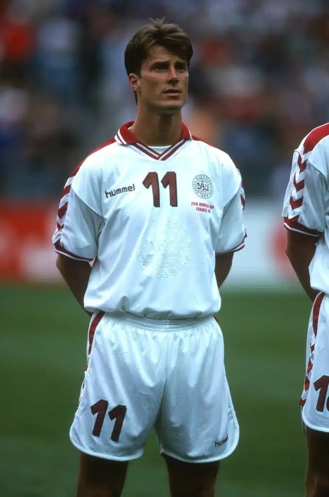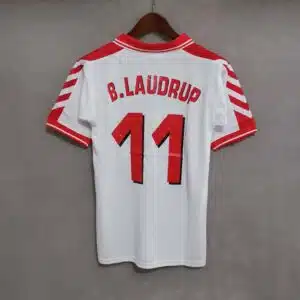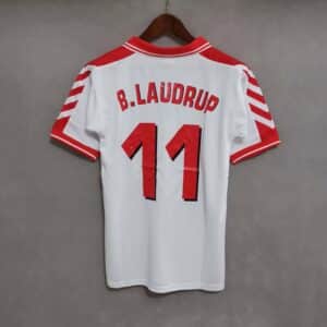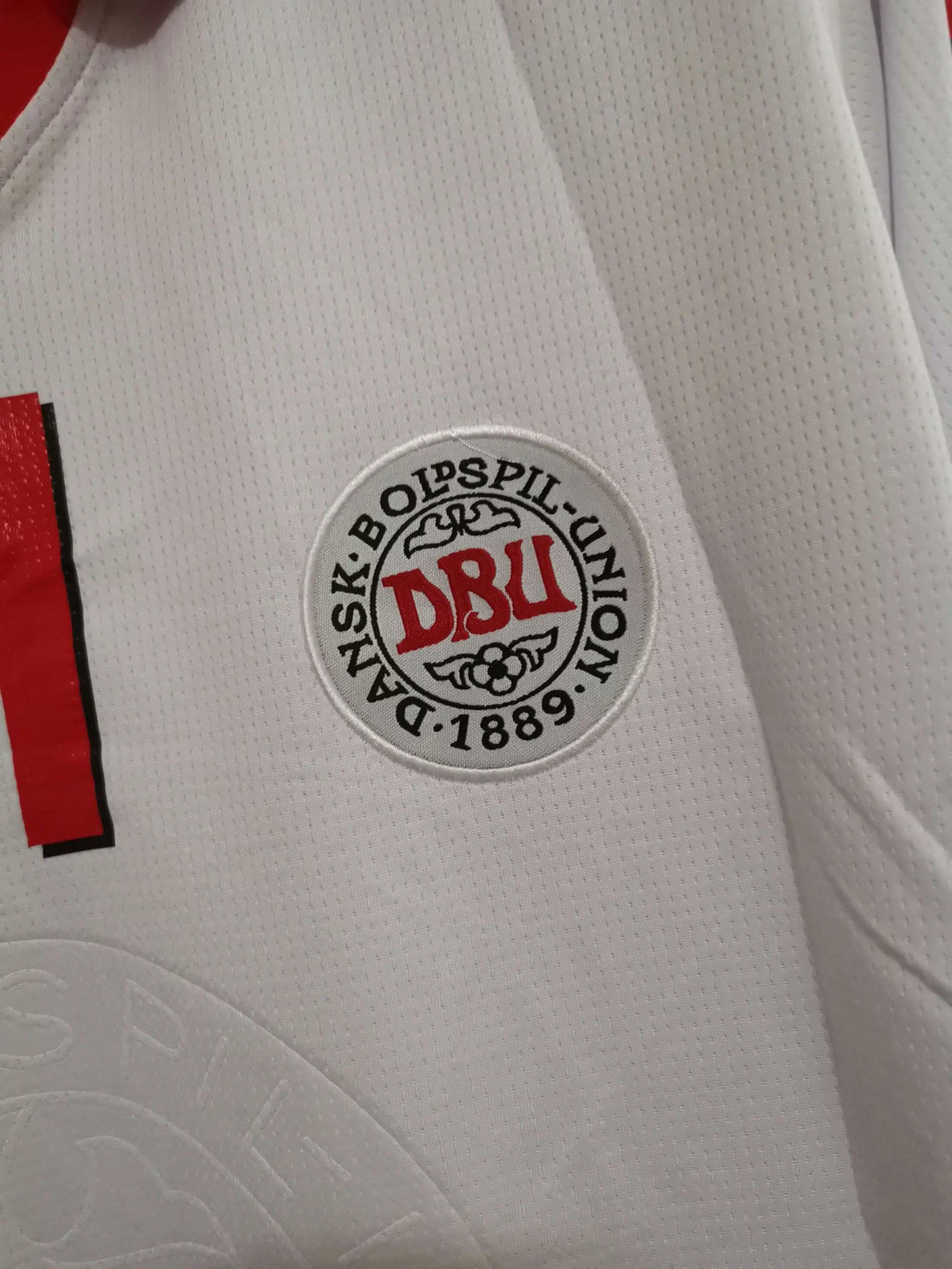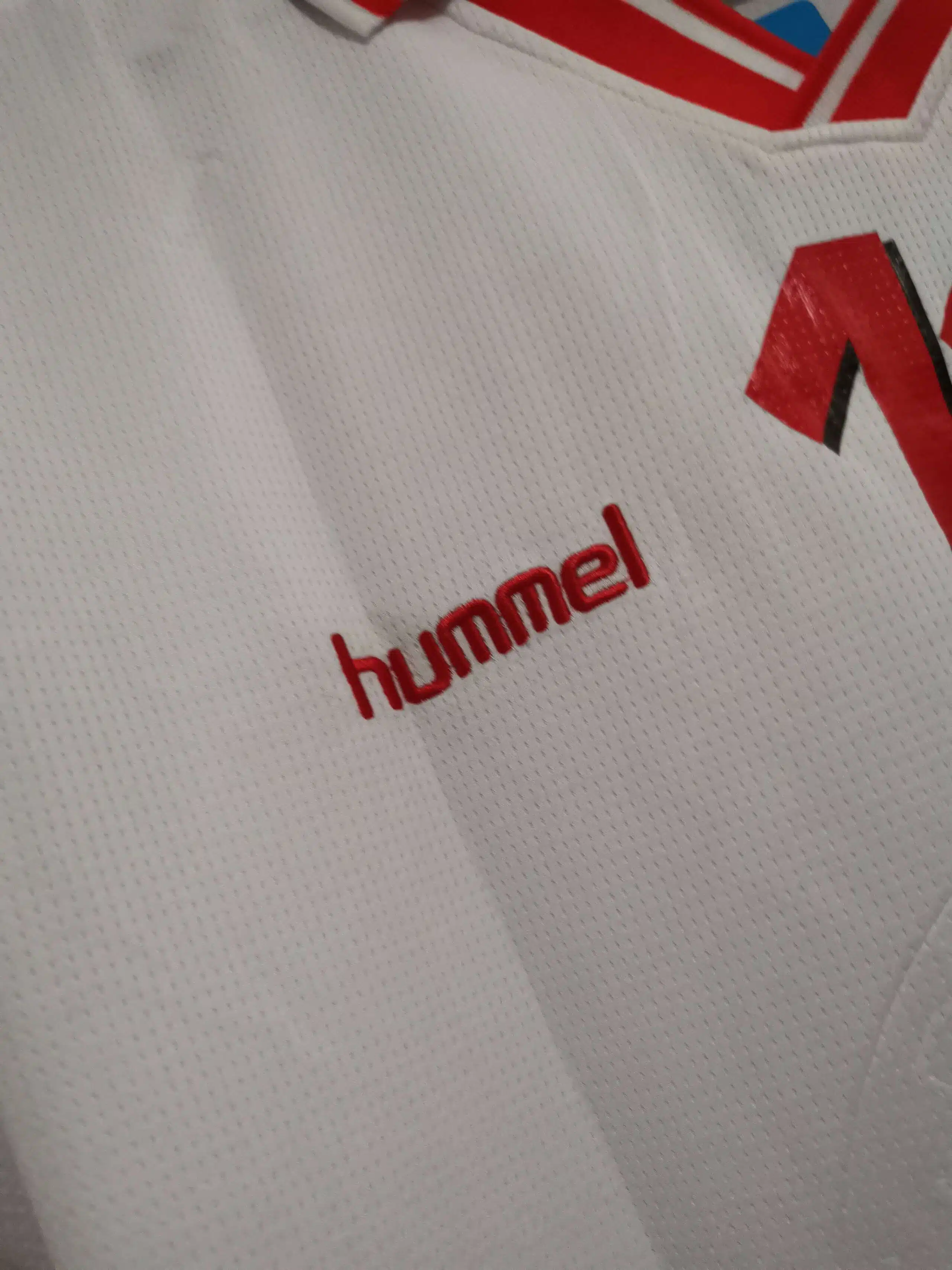 The 1998 Denmark away shirt presented a clean white base with red details on the shoulders and collar, paired with white shorts and socks. It carried the same modern Hummel design as the home version. This kit was worn during the 1998 World Cup, including the memorable 4–1 win over Nigeria in the Round of 16.