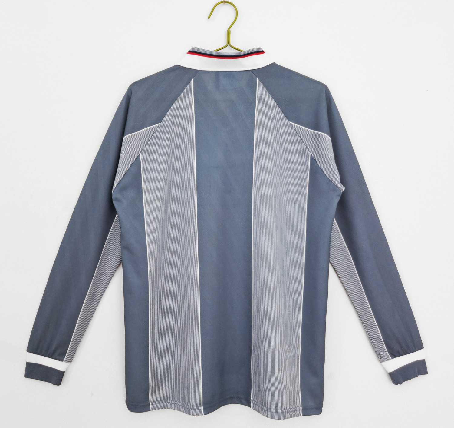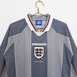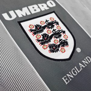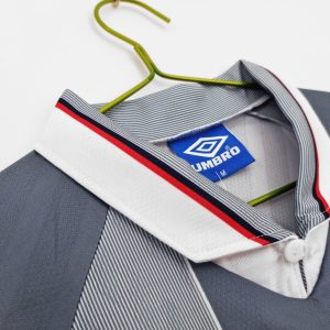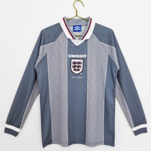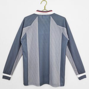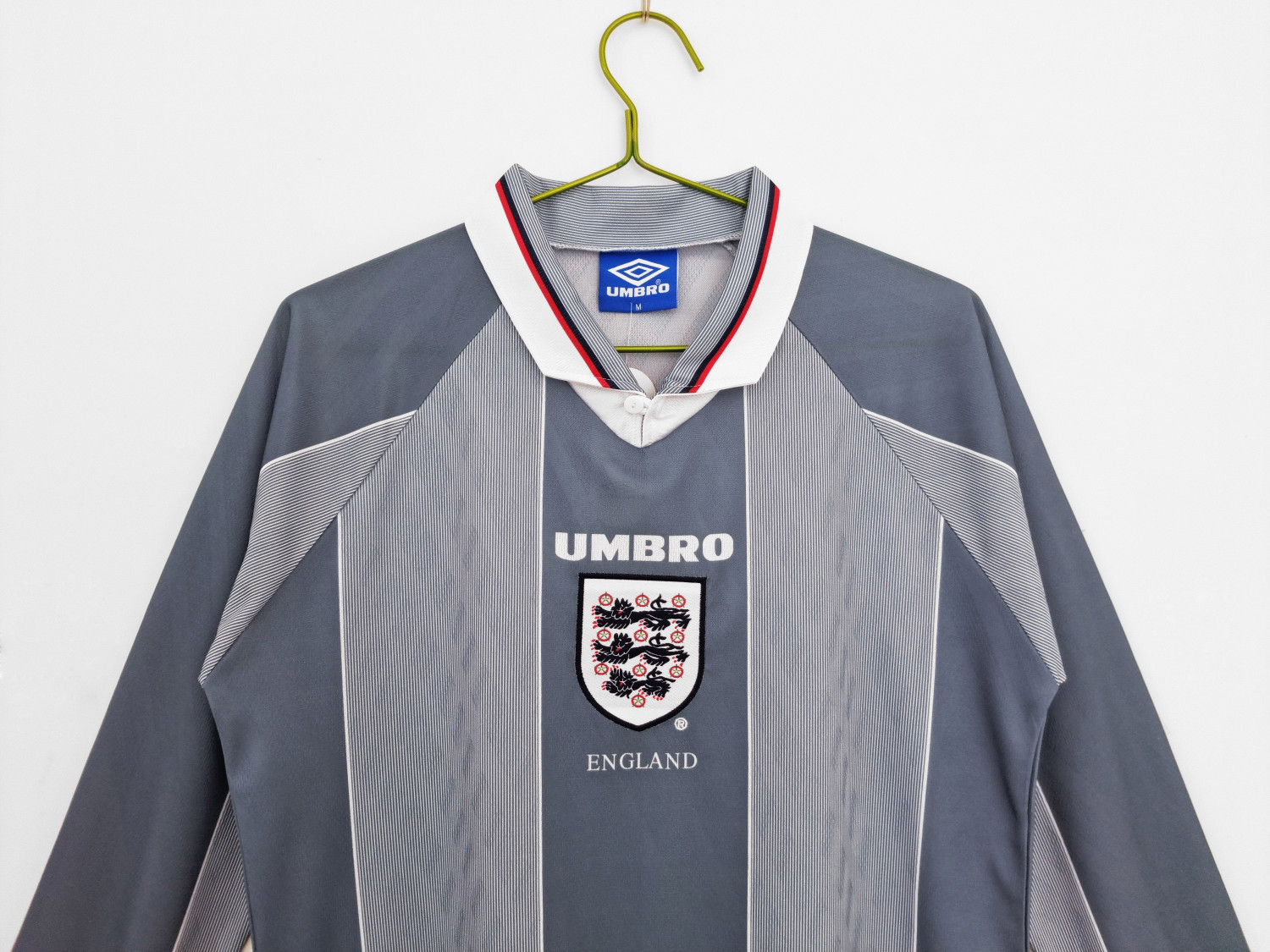 The England 1996 Away Kit – Long Sleeve featured the same light grey base with subtle tonal jacquard patterning as the short-sleeve version, finished with navy blue detailing on the collar and cuffs for a clean, refined look. The long sleeves added a classic, traditional feel that suited England’s Euro 96 campaign perfectly. Worn by players such as Alan Shearer, Paul Gascoigne, and Tony Adams, this long-sleeve away shirt has become a cult favourite, remembered for its elegance, uniqueness, and strong connection to one of the most iconic tournaments in England’s football history.
