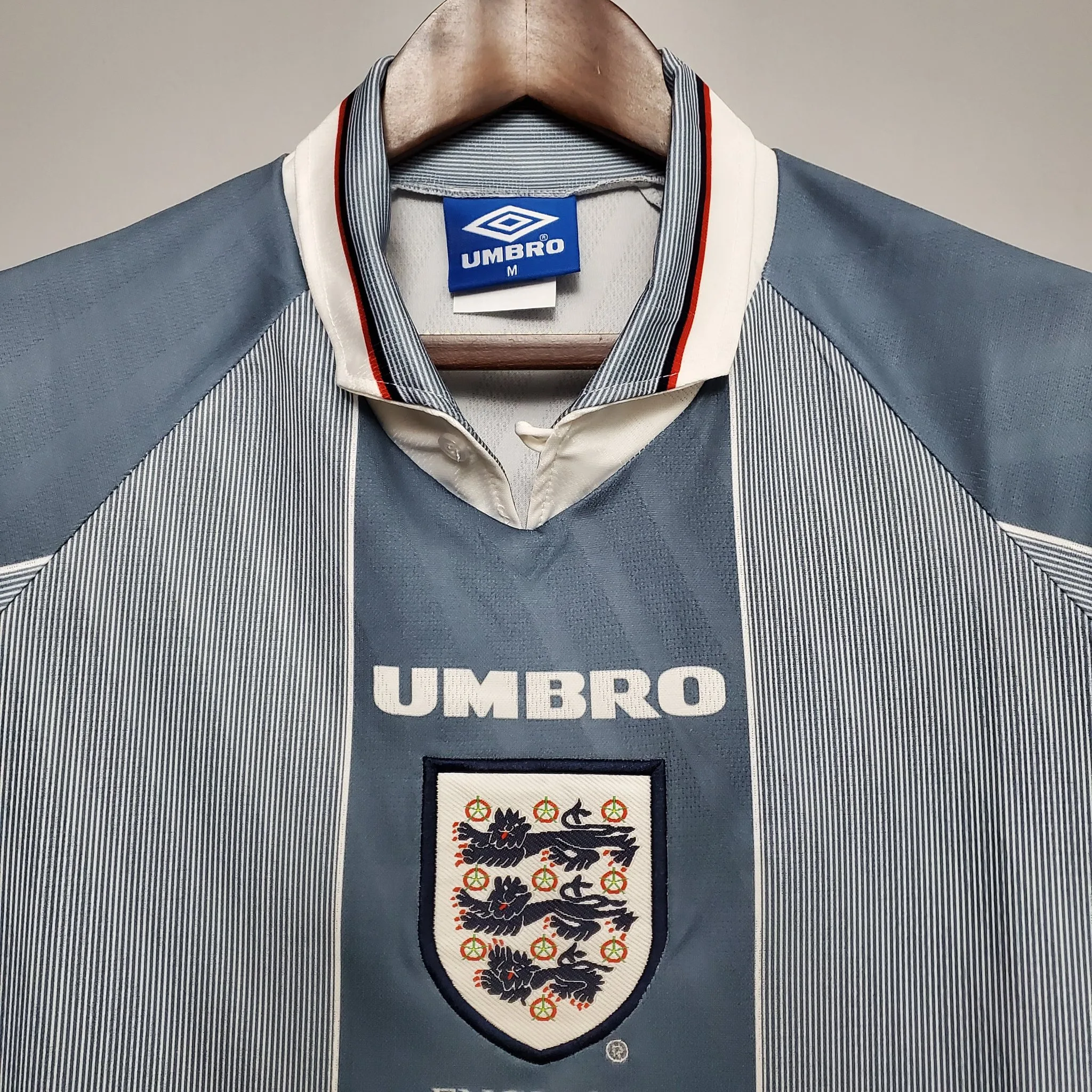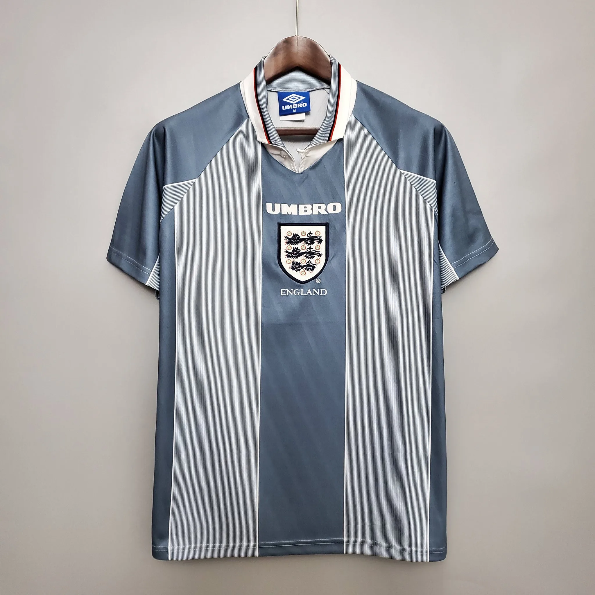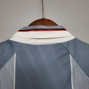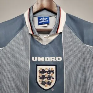 The England 1996 Away Kit featured a distinctive light grey base with subtle tonal jacquard patterning, complemented by navy blue detailing on the collar and sleeves. This understated and elegant design offered a sharp contrast to the classic white home shirt and perfectly captured the refined mid-90s aesthetic. Worn during Euro 96 by players such as Alan Shearer, Paul Gascoigne, and Darren Anderton, the grey away kit has since become a cult favourite, remembered for its uniqueness and its association with one of England’s most iconic tournament runs.