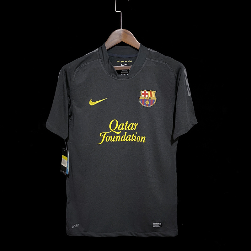 The FC Barcelona 2011/2012 Away Kit stood out with its striking black design and vibrant yellow-to-orange gradient band across the chest, giving the shirt a bold and modern identity. Paired with black shorts and socks, the kit delivered a powerful look on the pitch while maintaining Barcelona’s unique style. The Qatar Foundation sponsor featured across the chest alongside the club crest. Worn by players such as Lionel Messi, Xavi, and Andrés Iniesta, this away kit remains one of the most memorable Barcelona designs from the early 2010s.