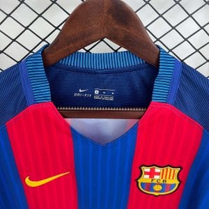 The 2014/15 Barcelona home shirt returned to a classic Blaugrana look with broad red and blue vertical stripes, paired with a yellow Catalan flag detail on the collar. Featuring the Qatar Airways sponsor, it was worn by stars like Lionel Messi, Neymar, and Luis Suárez during a historic season in which Barcelona won the La Liga, Copa del Rey, and UEFA Champions League treble.