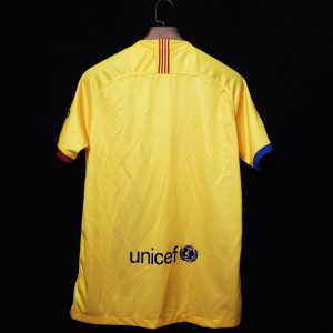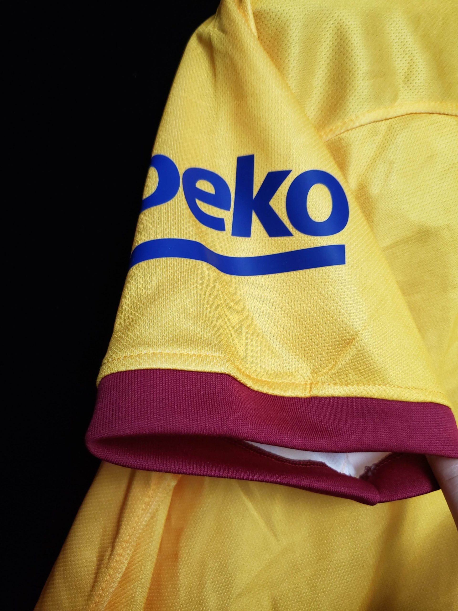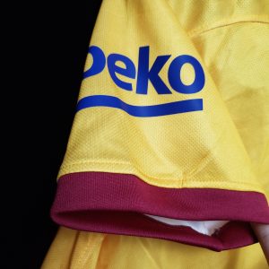 The 2019/20 Barcelona away shirt featured a striking yellow design with a diagonal red and blue sash, inspired by the club’s famous 1979 kit and the colors of the Catalan flag, the Senyera. It was paired with yellow shorts and socks, carrying the Rakuten sponsor across the chest alongside the club crest. Worn by stars such as Lionel Messi, Luis Suárez, and Antoine Griezmann, this kit became one of the most distinctive modern Barça designs, representing both the club’s identity and its Catalan pride during domestic and European campaigns.