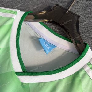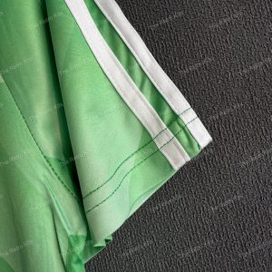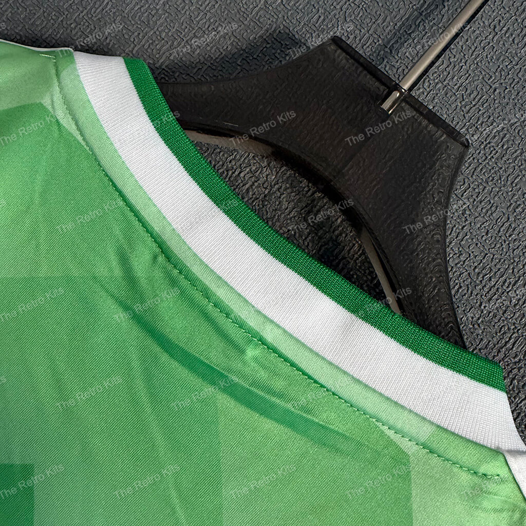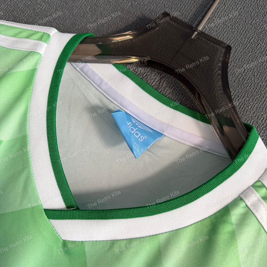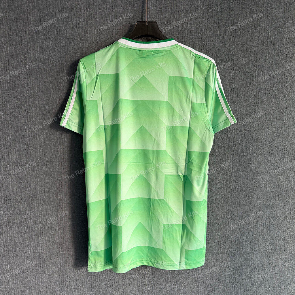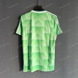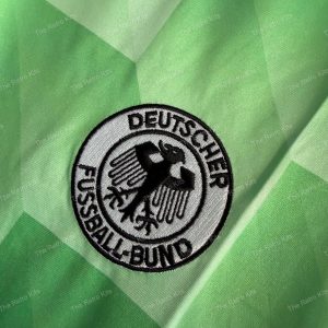 The 1990 West Germany away shirt featured a green design with white detailing, paired with white shorts and green socks. It carried the DFB eagle crest and was worn by players like Andreas Brehme, Jürgen Klinsmann, and Lothar Matthäus. This kit was used during the 1990 FIFA World Cup in Italy, most famously in the semi-final penalty shootout against England, en route to West Germany winning their third World Cup title.