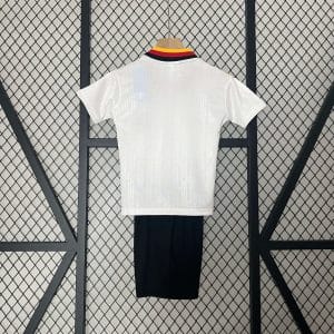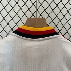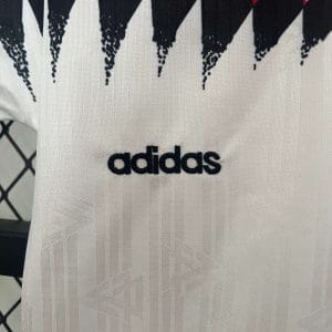 The 1994 Germany home shirt featured a white base with a bold diamond pattern across the shoulders in black, red, and gold, reflecting the national flag. It was paired with black shorts and white socks, keeping the nation’s traditional look. The DFB eagle crest sat proudly on the chest. Worn by players such as Jürgen Klinsmann, Lothar Matthäus, and Andreas Brehme, this kit was used at the 1994 FIFA World Cup in the USA, where Germany reached the quarter-finals.