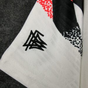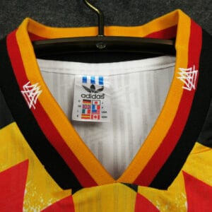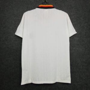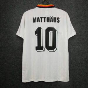 The 1994 Germany home shirt featured a white base with a bold black, red, and gold diamond pattern across the shoulders, reflecting the national flag. Paired with black shorts and white socks, it carried the DFB eagle crest on the chest. Worn by stars such as Jürgen Klinsmann, Lothar Matthäus, and Andreas Brehme, this kit was used at the 1994 FIFA World Cup in the USA, where Germany reached the quarter-finals.