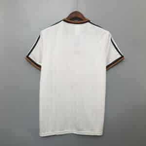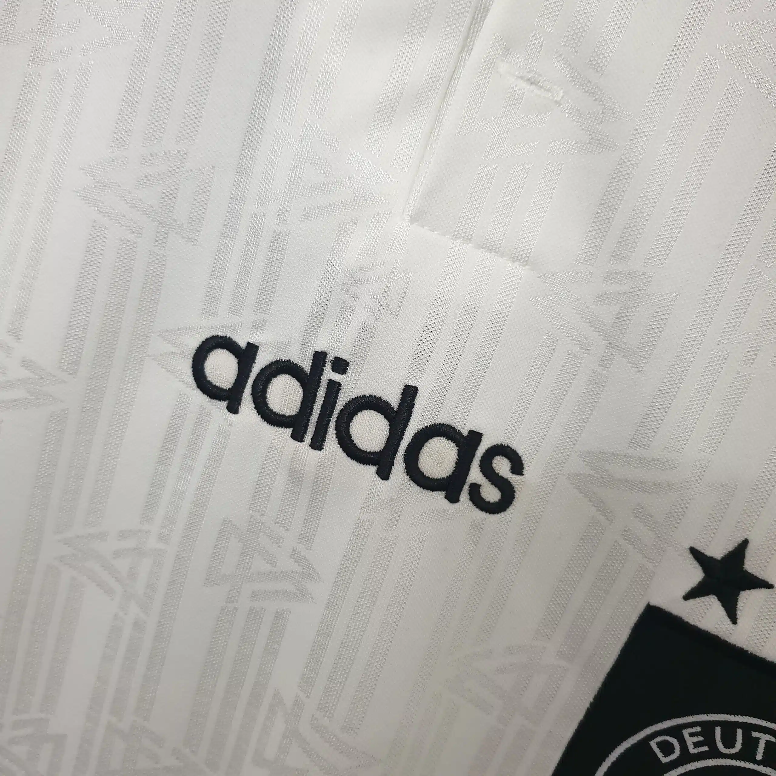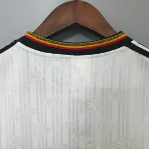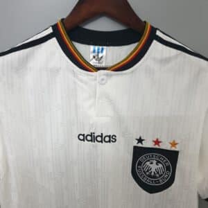 The 1996 Germany home shirt featured a white design with black trim, paired with black shorts and white socks. A thin black, red, and gold stripe ran along the collar and cuffs, symbolising national pride. The DFB eagle crest with three stars sat on the chest. Worn by Matthias Sammer, Jürgen Klinsmann, and Andreas Köpke, this kit became historic at UEFA Euro 1996 in England, where Germany were crowned champions.