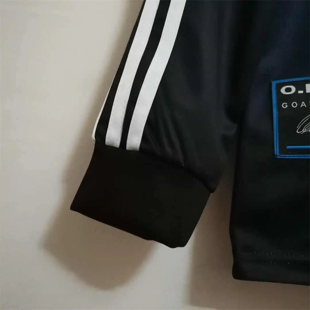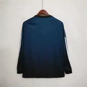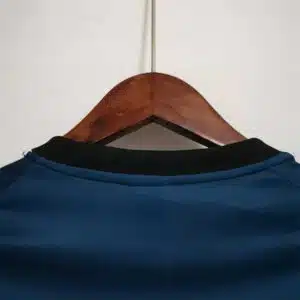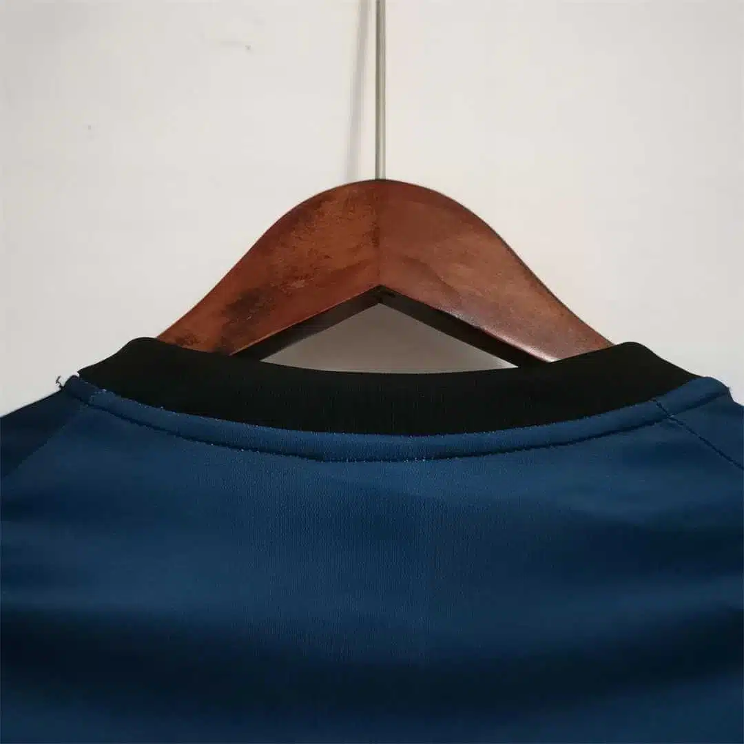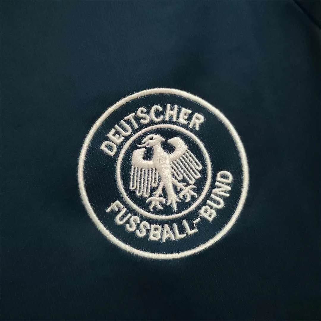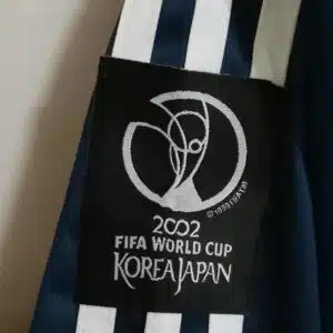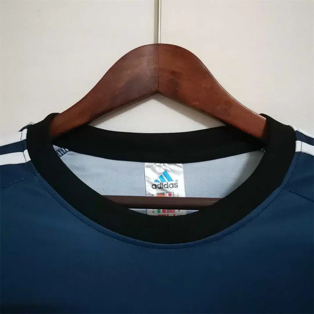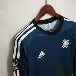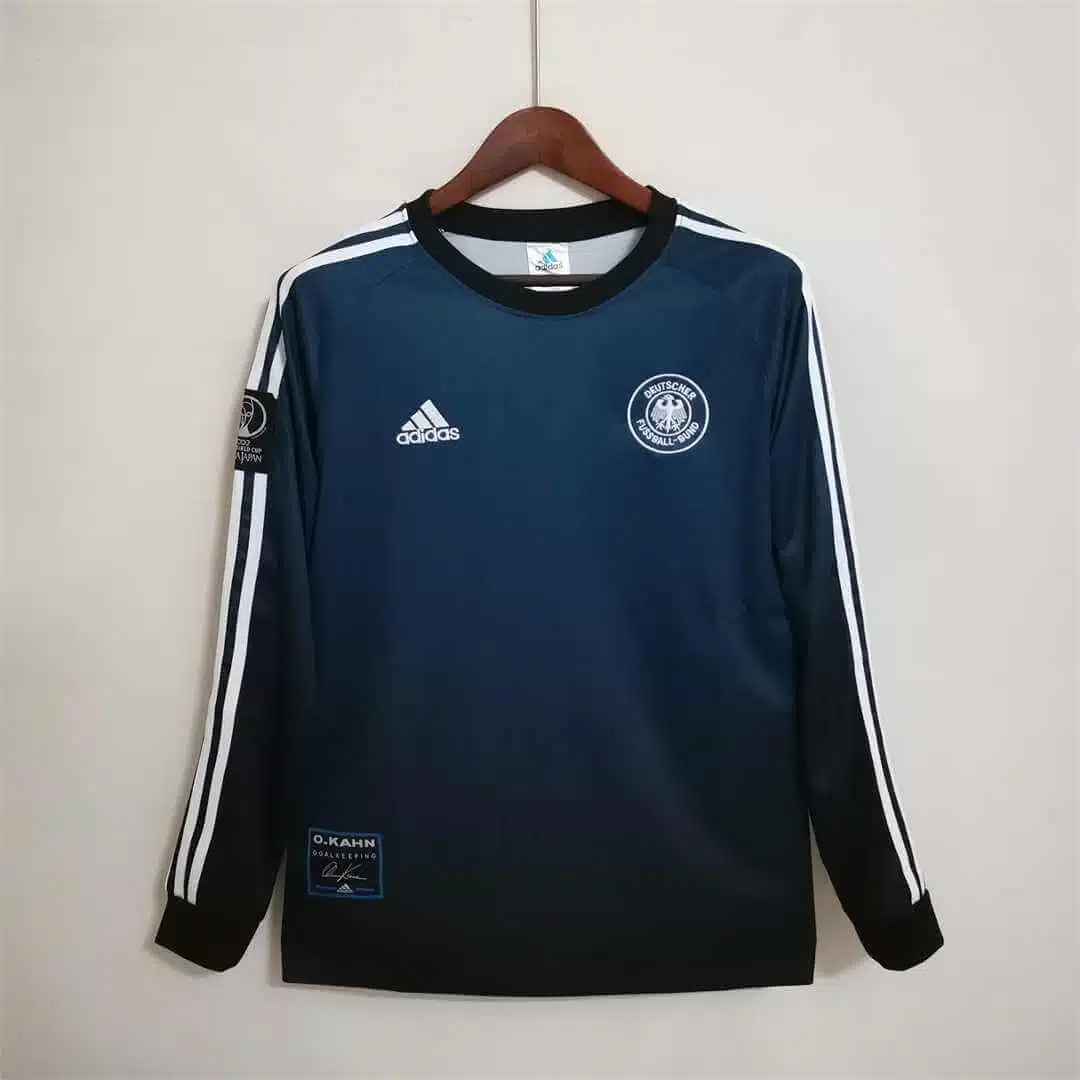The 2002 Germany goalkeeper home shirt, worn famously by Oliver Kahn, featured a long-sleeve blue design with black detailing. Paired with black shorts and socks, it carried the DFB crest on the chest. This iconic kit was worn throughout the 2002 FIFA World Cup in Japan/Korea, where Kahn captained Germany to the final against Brazil and won the Golden Ball as the tournament’s best player.