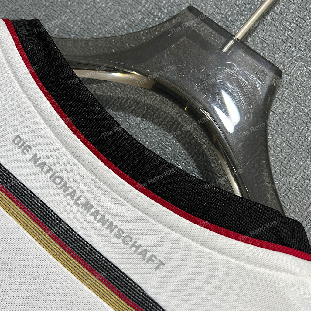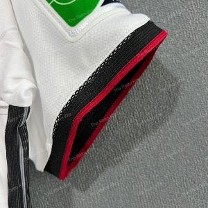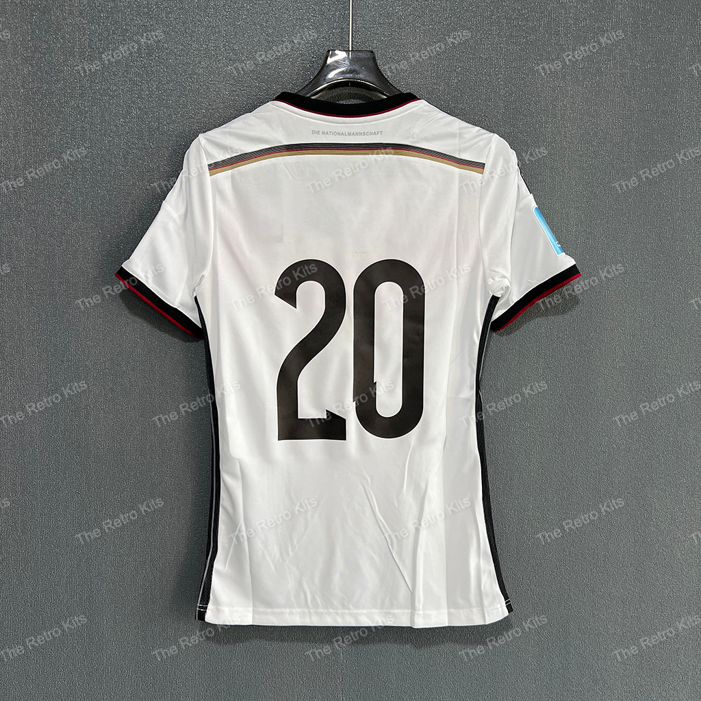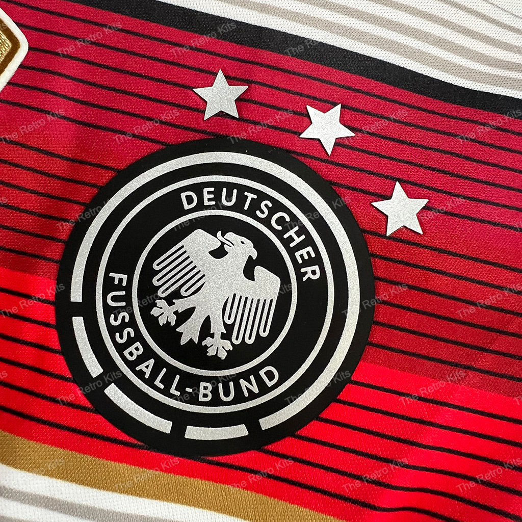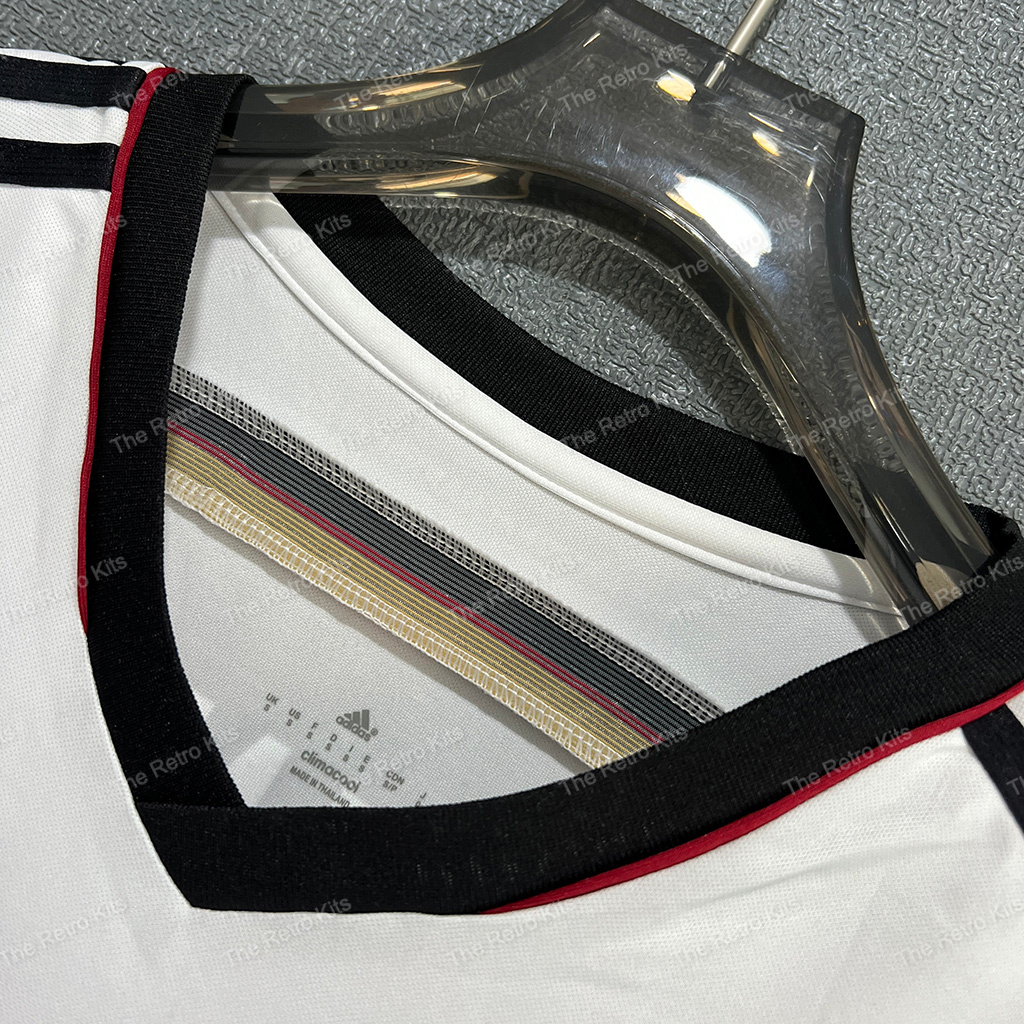 The 2014 Germany home shirt featured a modern white design with a bold red and black chevron graphic across the chest, paired with black shorts and white socks. The kit displayed the DFB eagle crest with three stars above it, representing Germany’s previous World Cup wins. Worn by players such as Philipp Lahm, Thomas Müller, and Miroslav Klose, this shirt became legendary at the 2014 FIFA World Cup in Brazil, where Germany defeated Argentina in the final to claim their fourth world title.