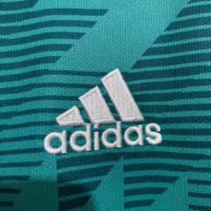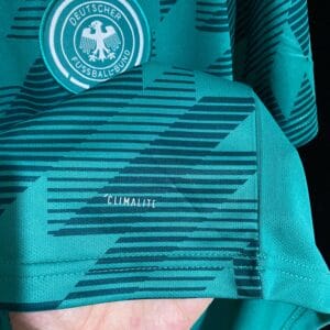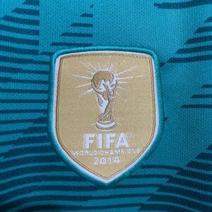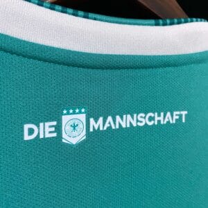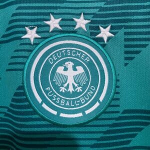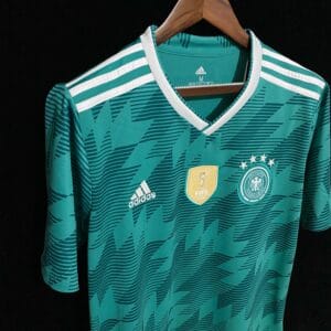The 2018 Germany away shirt featured a green base with a retro-inspired geometric pattern, referencing the away shirt from 1990. Paired with white shorts and green socks, it displayed the DFB crest with four stars. Worn by players like Mats Hummels, Toni Kroos, and Mesut Özil, this kit was used at the 2018 FIFA World Cup in Russia, though Germany endured a disappointing group-stage exit.