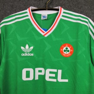 Worn by Packie Bonner, Paul McGrath, and Kevin Sheedy during their iconic debut at the FIFA World Cup in Italy, reaching the quarter-finals in a historic run under Jack Charlton.