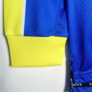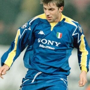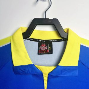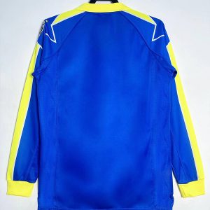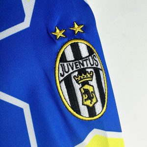The 1997/98 Juventus away shirt featured a blue design with yellow detailing, most notably the large central yellow star motif on the chest. It carried the Sony sponsor across the front. Worn by legends such as Zinedine Zidane, Alessandro Del Piero, and Edgar Davids, this bold kit became iconic as Juventus secured the Serie A title and reached the UEFA Champions League Final against Real Madrid.