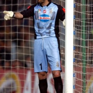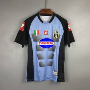 The 2002/03 Juventus goalkeeper shirt featured a blue design with black trim, proudly displaying the Tamoil sponsor across the chest. Worn by Gianluigi Buffon, this kit was part of a memorable season in which Juventus were crowned Serie A champions and reached the UEFA Champions League Final. Buffon’s performances in this shirt, including crucial saves in Europe, reinforced his reputation as one of the world’s best goalkeepers.