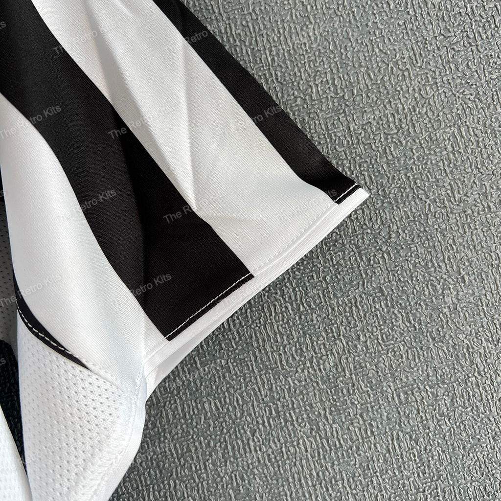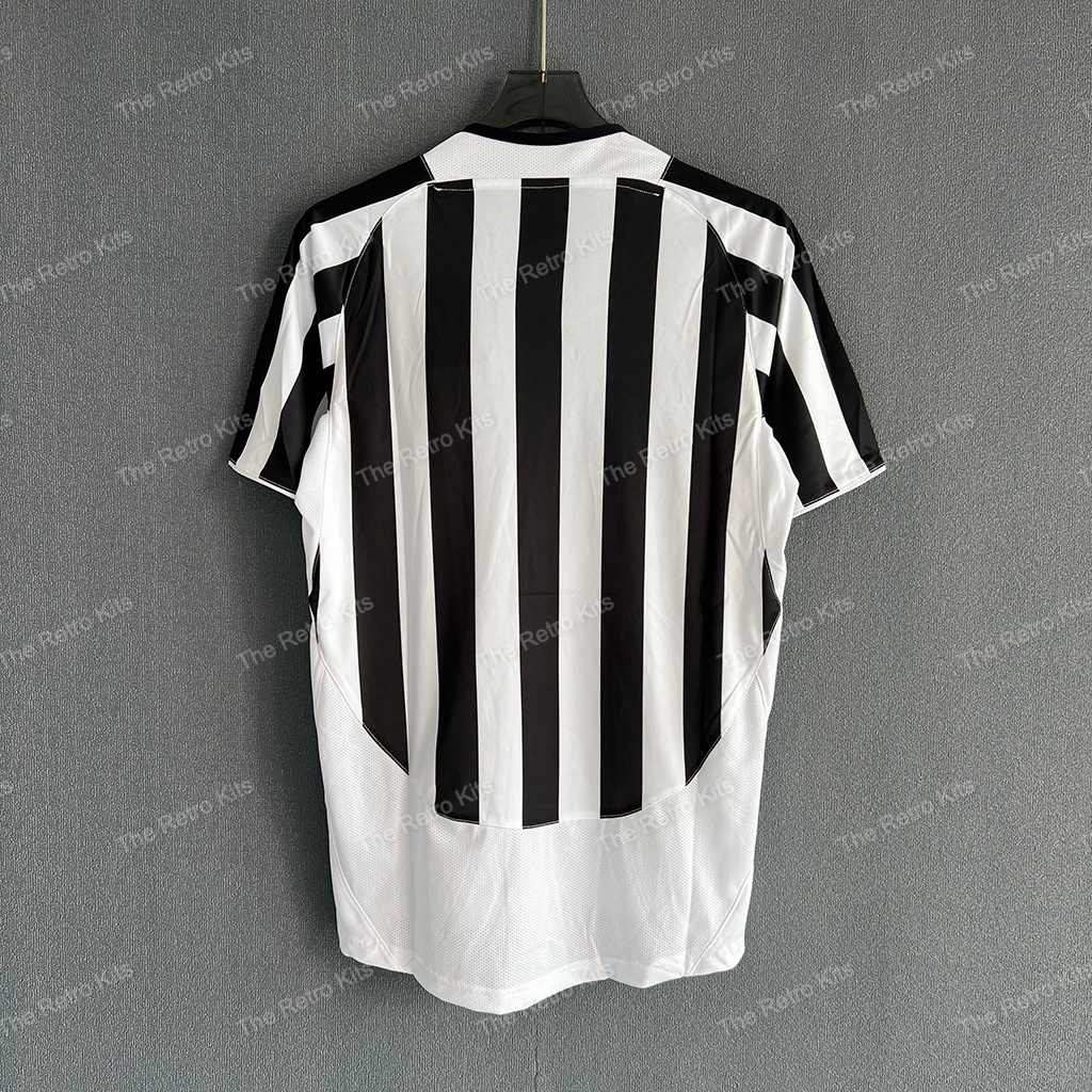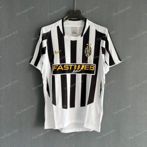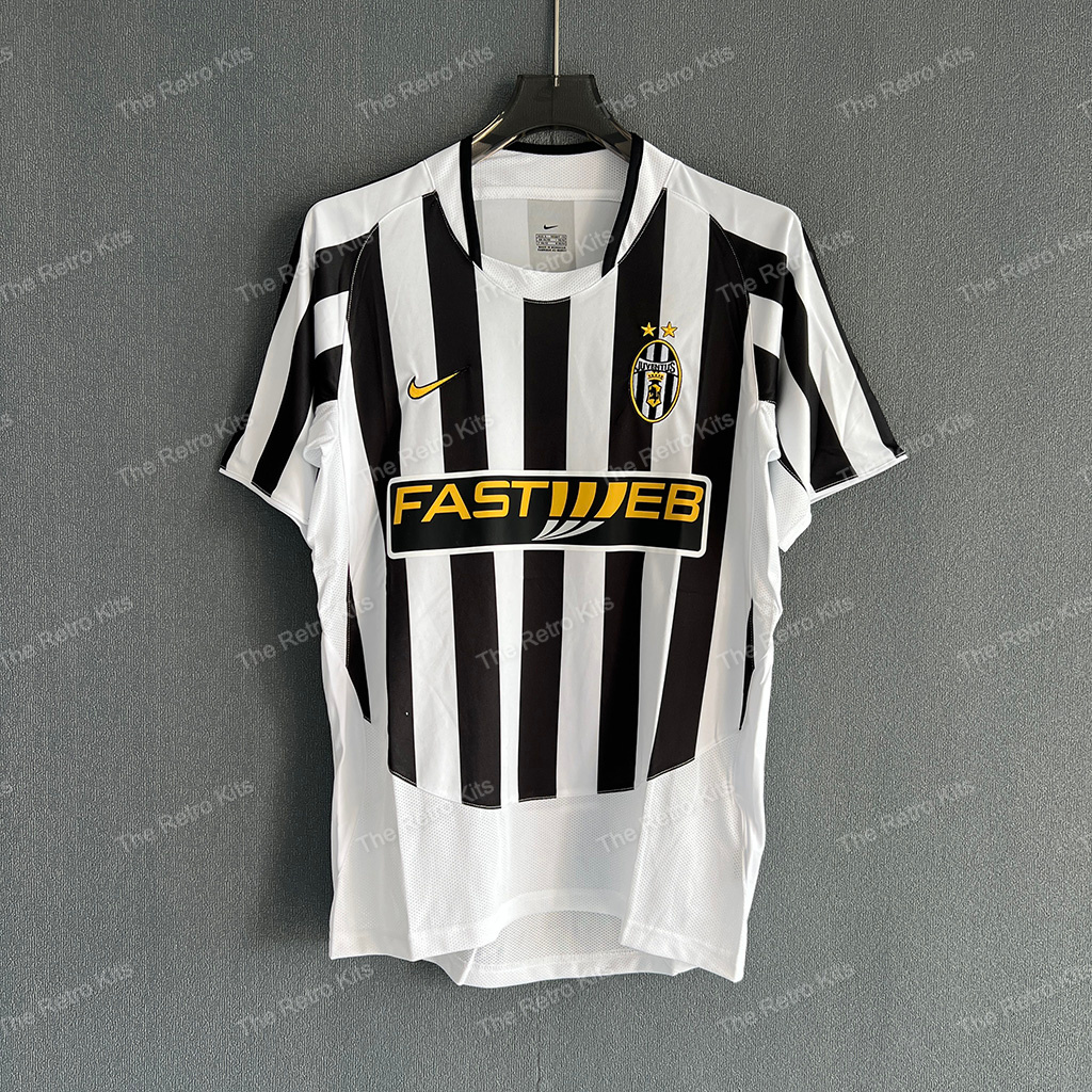 The 2003/04 Juventus home shirt featured the club’s traditional black and white vertical stripes, paired with black shorts and white socks. It carried the Fastweb sponsor across the chest. Worn by players such as Alessandro Del Piero, Pavel Nedvěd, and David Trezeguet, this kit represented Juve during Marcello Lippi’s final season in charge, as they finished 3rd in Serie A and competed in the UEFA Champions League.