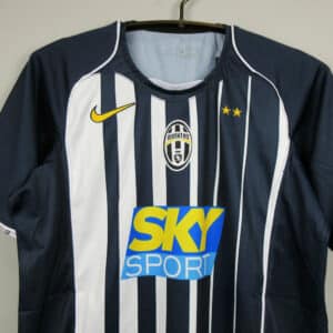 The 2004/05 Juventus away shirt featured a black design with white trim, providing a sleek and modern alternative to the home stripes. It carried the Tamoil sponsor domestically, while the Sky Sport sponsor appeared on shirts used in European competitions. Worn by players such as Alessandro Del Piero, Zlatan Ibrahimović, and Pavel Nedvěd, this kit was part of Juve’s successful season under Fabio Capello, as they claimed the Serie A title.