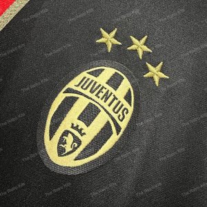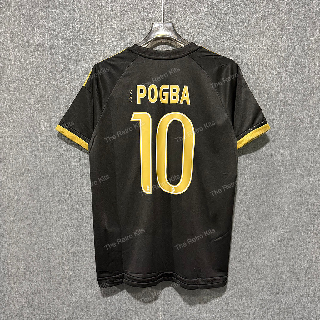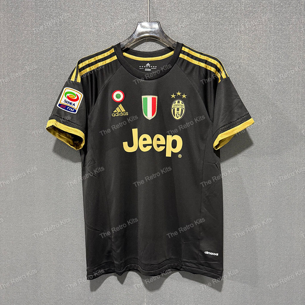 The 2015/16 Juventus third shirt featured a bold black design with gold detailing, including the crest and sponsor, giving it a sleek and modern look. The kit carried the Jeep sponsor across the chest. Worn by stars such as Paul Pogba, Paulo Dybala, and Gianluigi Buffon, this kit was used primarily in European and select domestic matches, becoming a fan favourite during a season in which Juventus won both the Serie A title and the Coppa Italia.