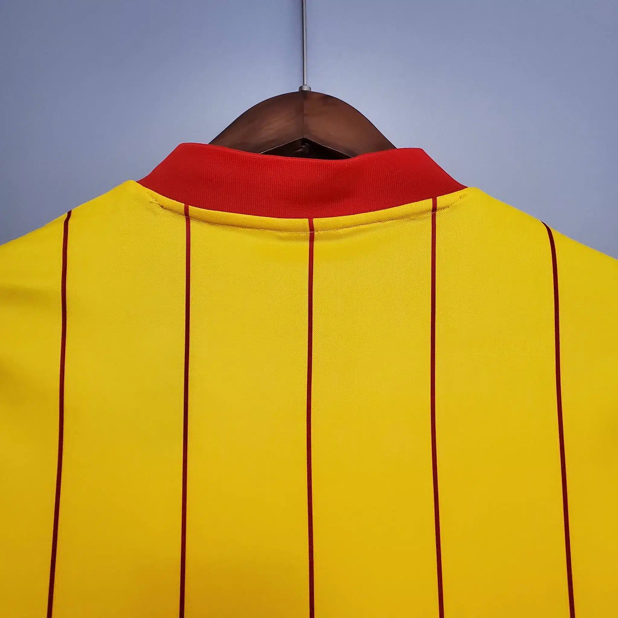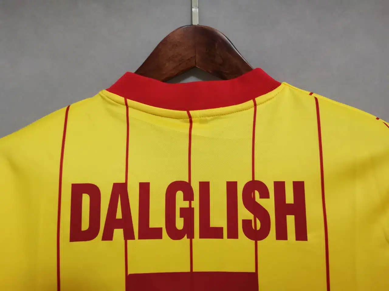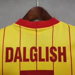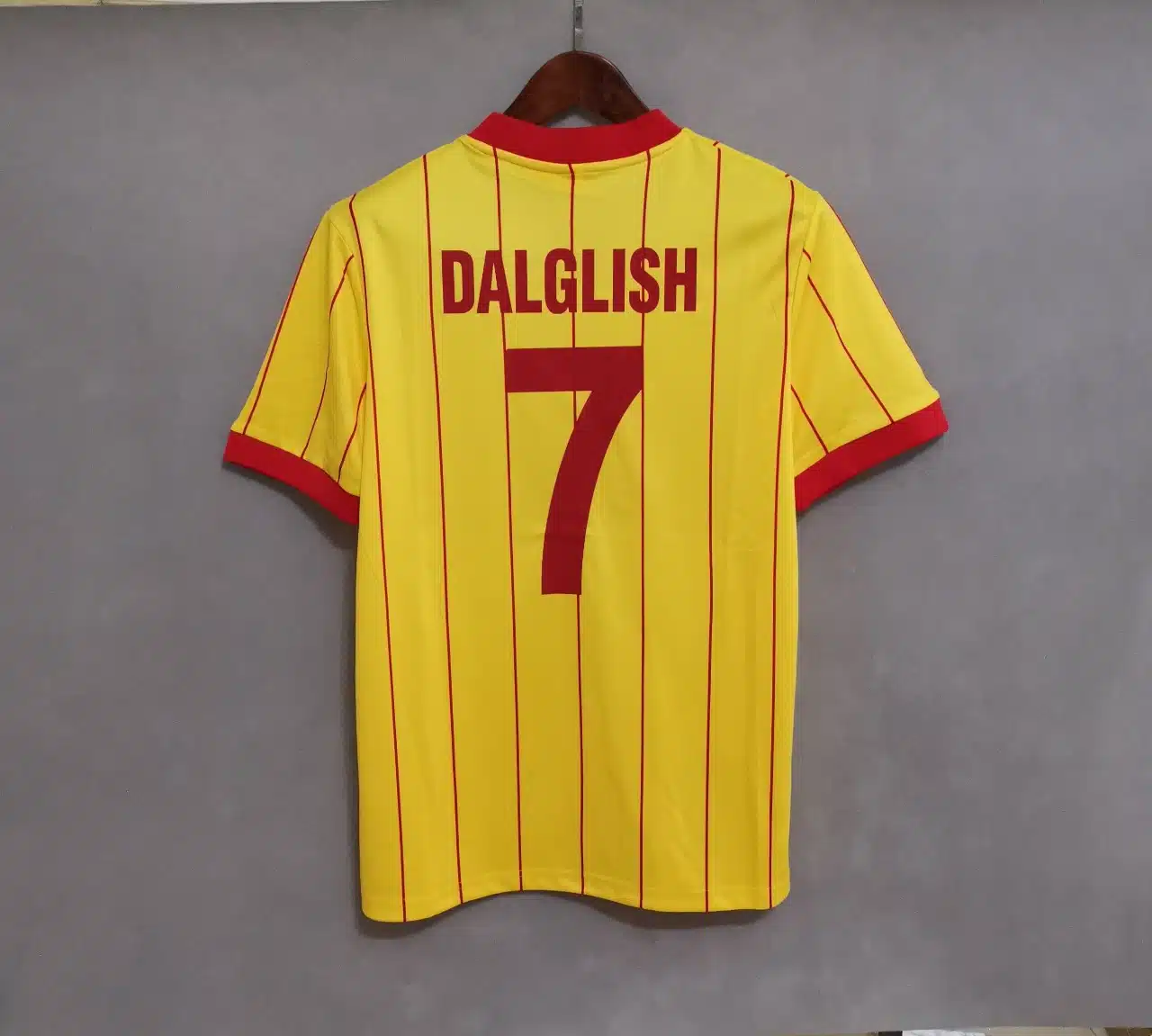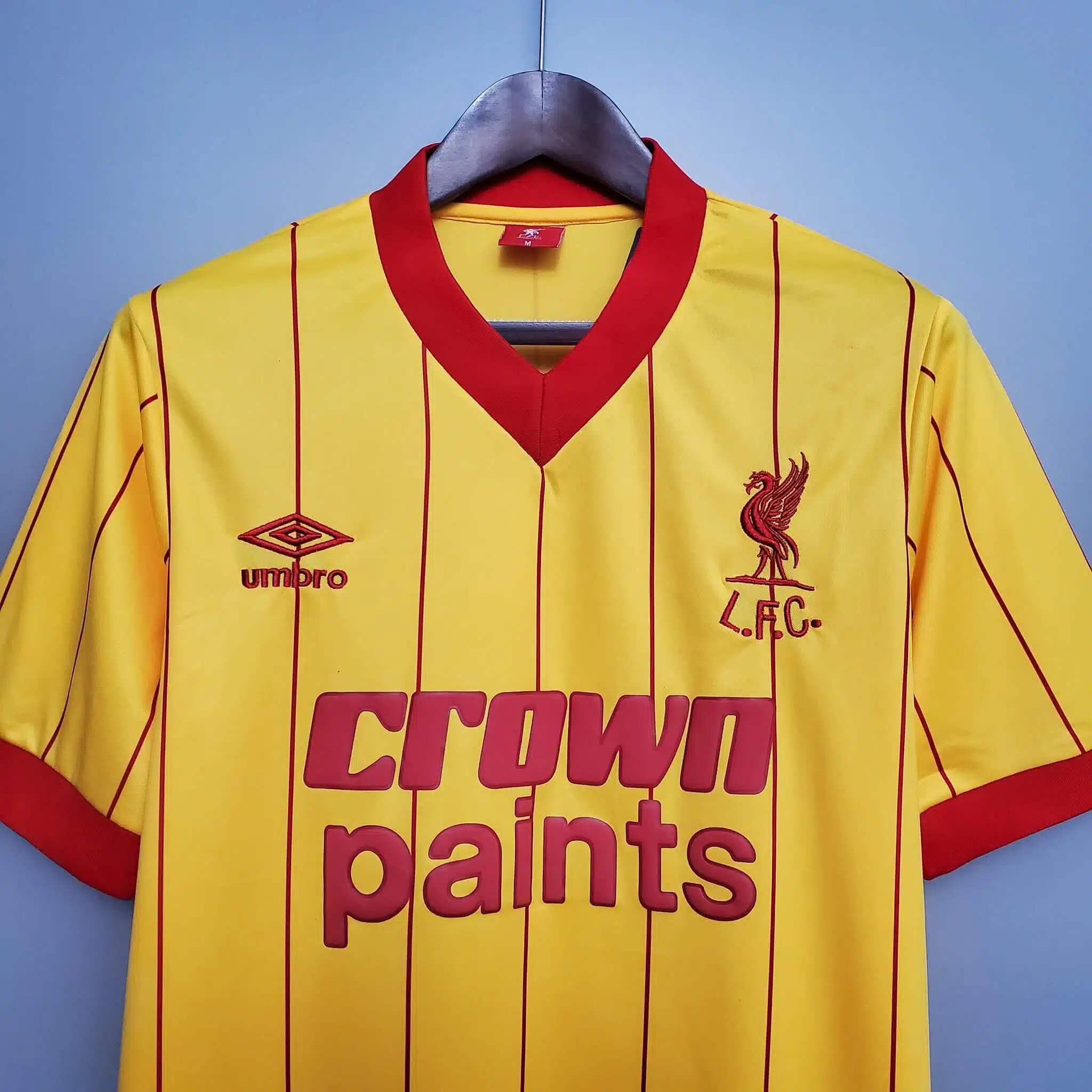 The 1982–84 Liverpool away shirt featured a yellow design with red trim, complemented by the Crown Paints sponsor across the chest. Worn by players such as Kenny Dalglish, Ian Rush, and Graeme Souness, this kit represented Liverpool during a golden era, as the club secured the 1983 and 1984 First Division titles, the 1984 League Cup, and the 1984 European Cup in Rome.