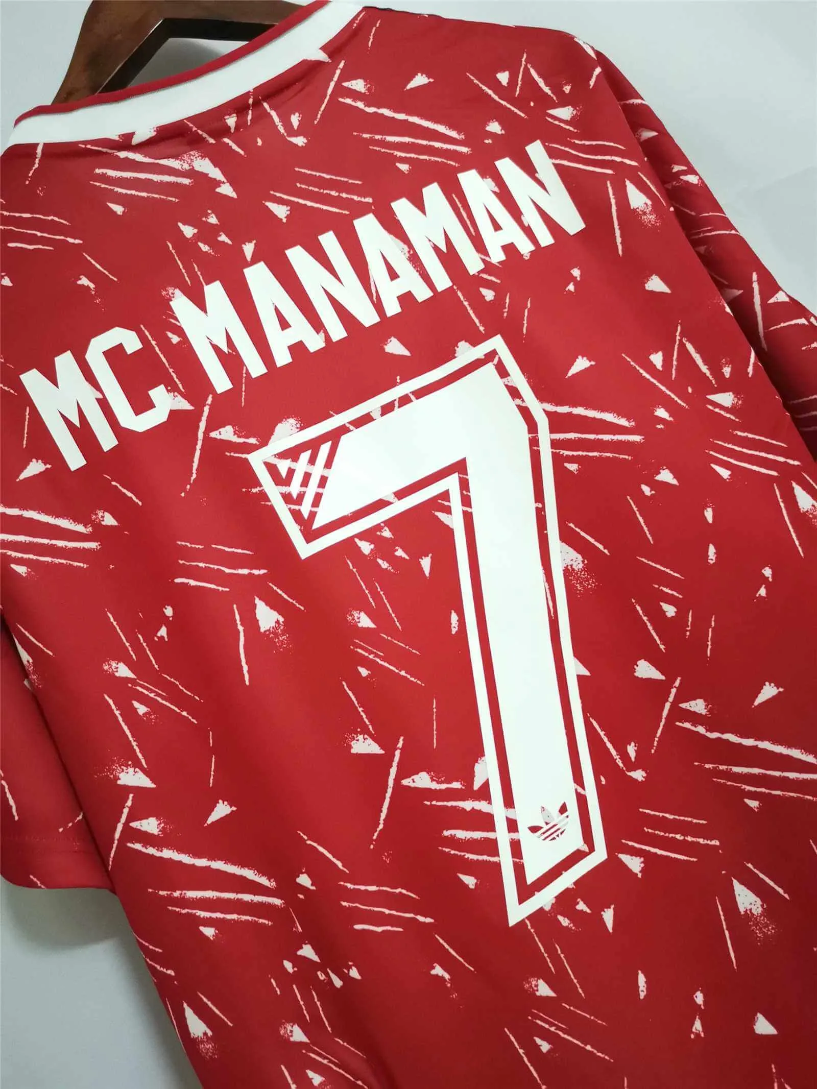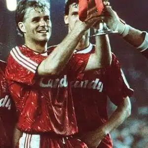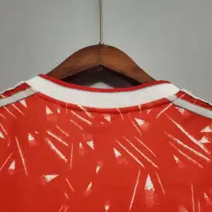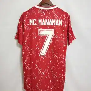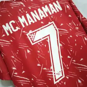 The 1989–91 Liverpool home shirt featured a classic all-red design with distinctive triangular white patterns, proudly displaying the Candy sponsor across the chest. Worn by players such as John Barnes, Ian Rush, and Peter Beardsley, this kit is remembered for the club’s 1990 First Division title win, which stood as Liverpool’s last league championship before the Premier League era.