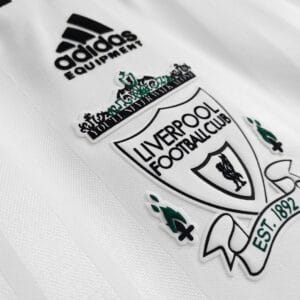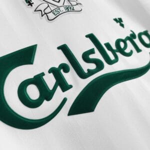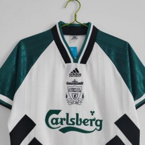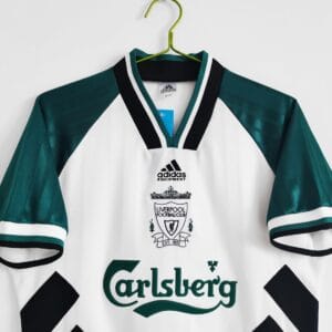 The 1993–95 Liverpool away shirt featured a green design with white chest panel and black trim, highlighted by the bold Carlsberg sponsor across the front. Worn by players such as Robbie Fowler, Ian Rush, and Steve McManaman, this kit became memorable during the early Premier League years, as Fowler emerged as one of the league’s most prolific young strikers.