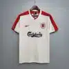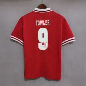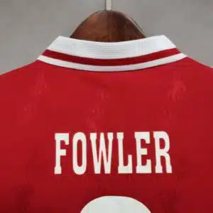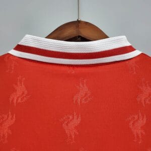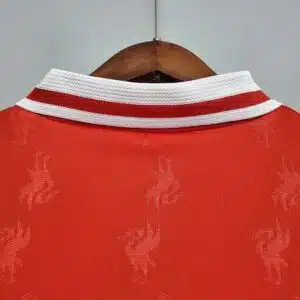 The 1996–98 Liverpool home shirt featured a classic all-red design with white collar and trim, highlighted by the Carlsberg sponsor across the chest. Worn by players such as Robbie Fowler, Steve McManaman, and Michael Owen, this kit became memorable in the early Premier League era as Liverpool competed strongly in domestic competitions under manager Roy Evans.