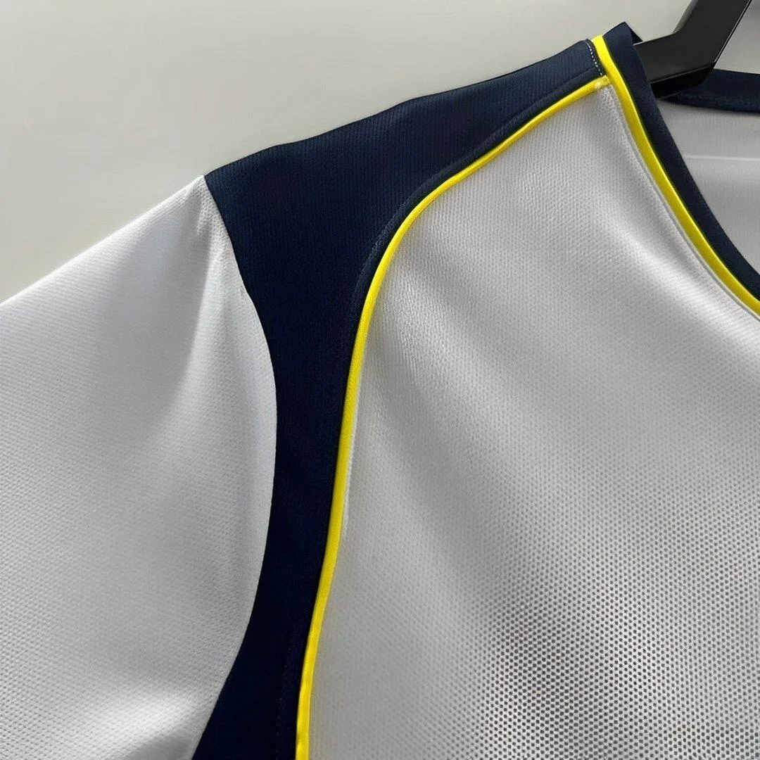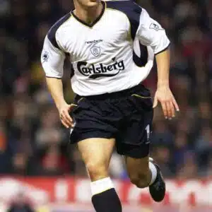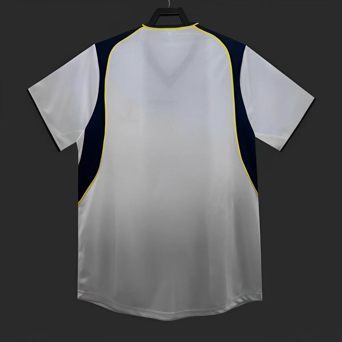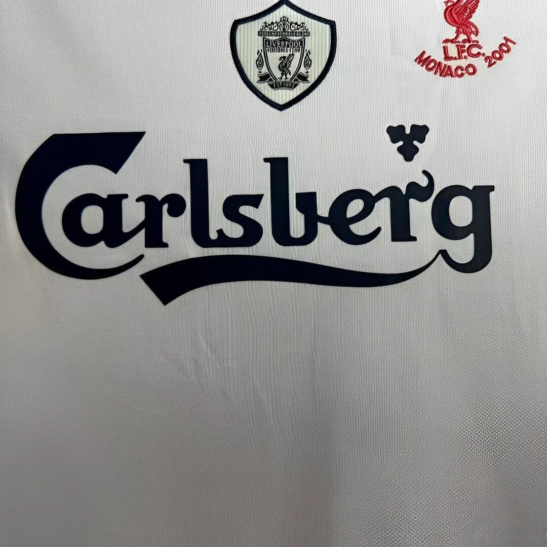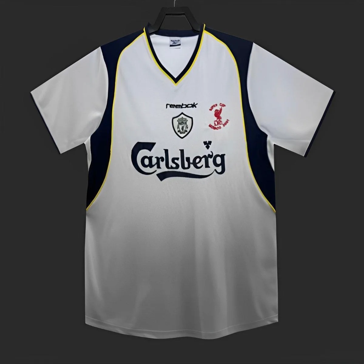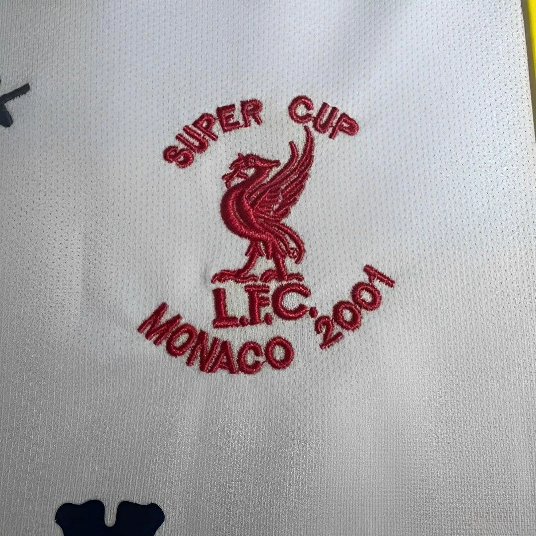 The 2001/02 Liverpool kit worn in the UEFA Super Cup featured a classic all-red design with white trim, proudly displaying the Carlsberg sponsor across the chest and the official UEFA Super Cup patches on the sleeves. Worn by players such as Steven Gerrard, Michael Owen, and Sami Hyypiä, this kit became iconic as Liverpool defeated Bayern Munich 3–2 in Monaco, lifting the UEFA Super Cup to add to their treble success of the previous season.