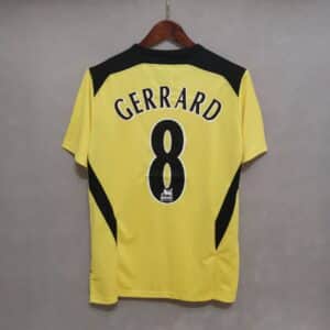 The 2004/05 Liverpool away shirt featured a white design with red trim, proudly displaying the Carlsberg sponsor across the chest. Worn by players such as Steven Gerrard, Xabi Alonso, and Luis GarcÃa, this kit became memorable during Liverpool’s famous UEFA Champions League campaign, including crucial away victories on the road to the legendary Istanbul final, where they lifted their fifth European Cup.