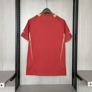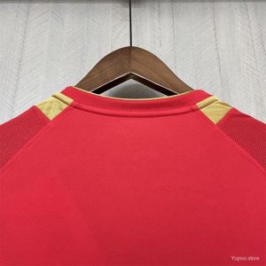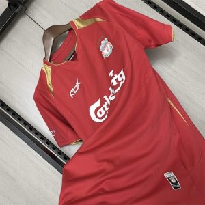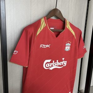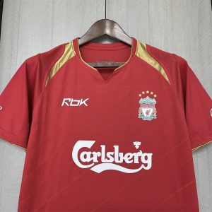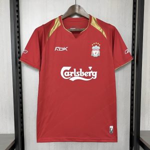 The 2005/06 Liverpool home shirt for the UEFA Champions League featured a classic all-red design with white trim, carrying the Carlsberg sponsor across the chest and the Champions League starball patches on the sleeves. Worn by players such as Steven Gerrard, Xabi Alonso, and Jamie Carragher, this kit represented Liverpool as the defending European champions, with the squad reaching the Round of 16 before being eliminated by Benfica.