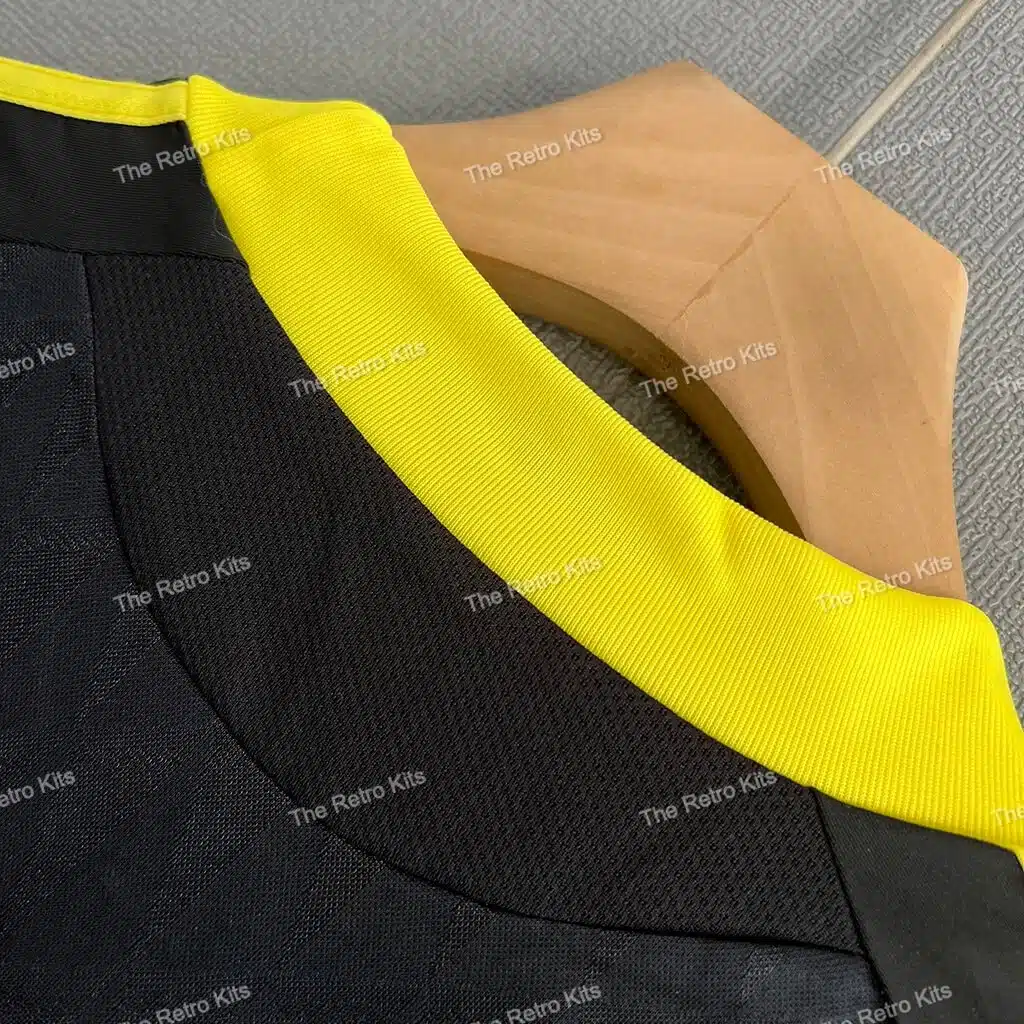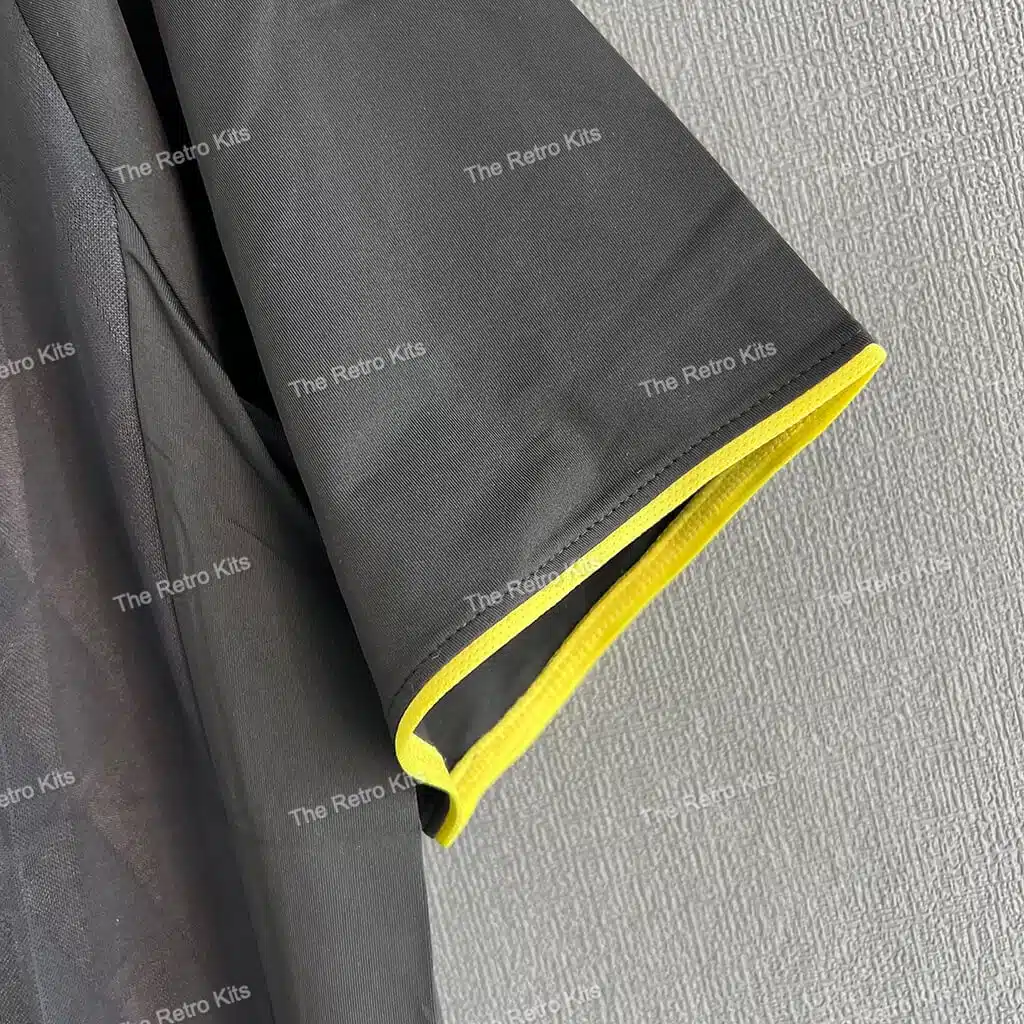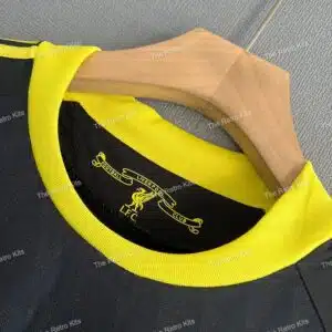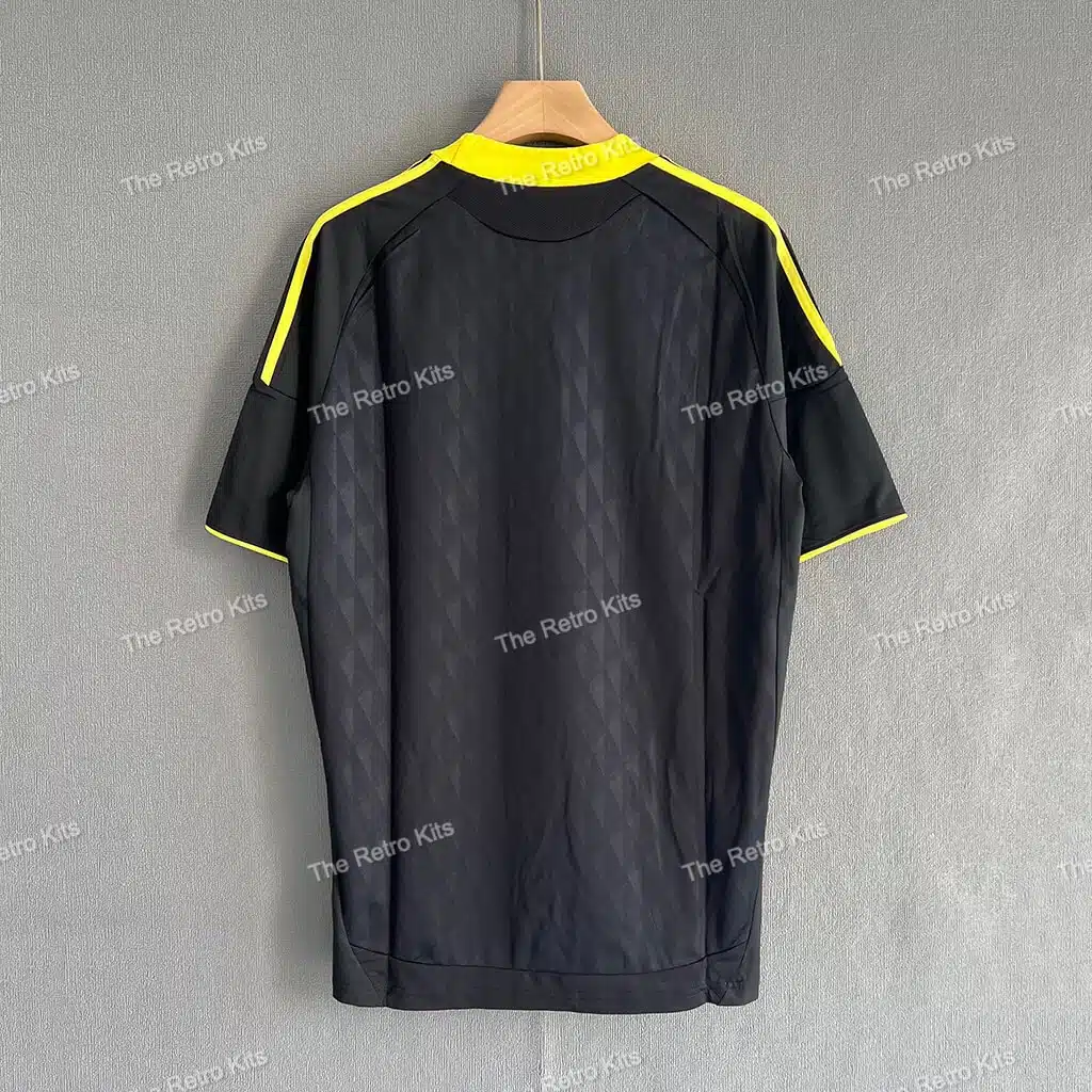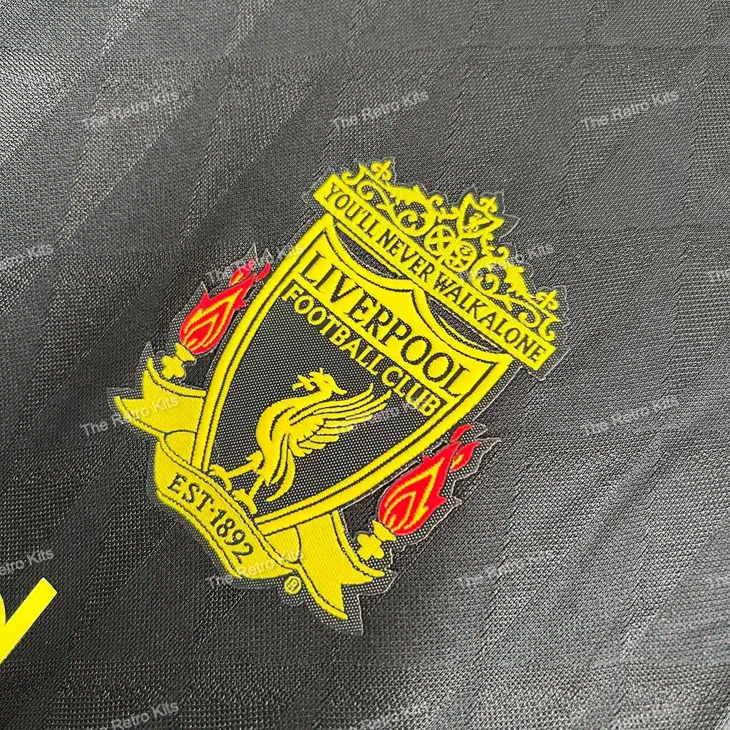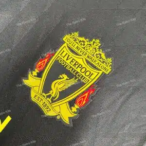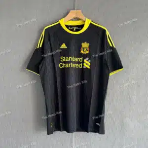 The 2010/11 Liverpool third shirt featured a black design with cyan blue trim, highlighted by the Standard Chartered sponsor across the chest. Worn by players such as Steven Gerrard, Fernando Torres, and Dirk Kuyt, this kit was used in both the Premier League and the Europa League, giving Liverpool a modern alternative look during a transitional season.