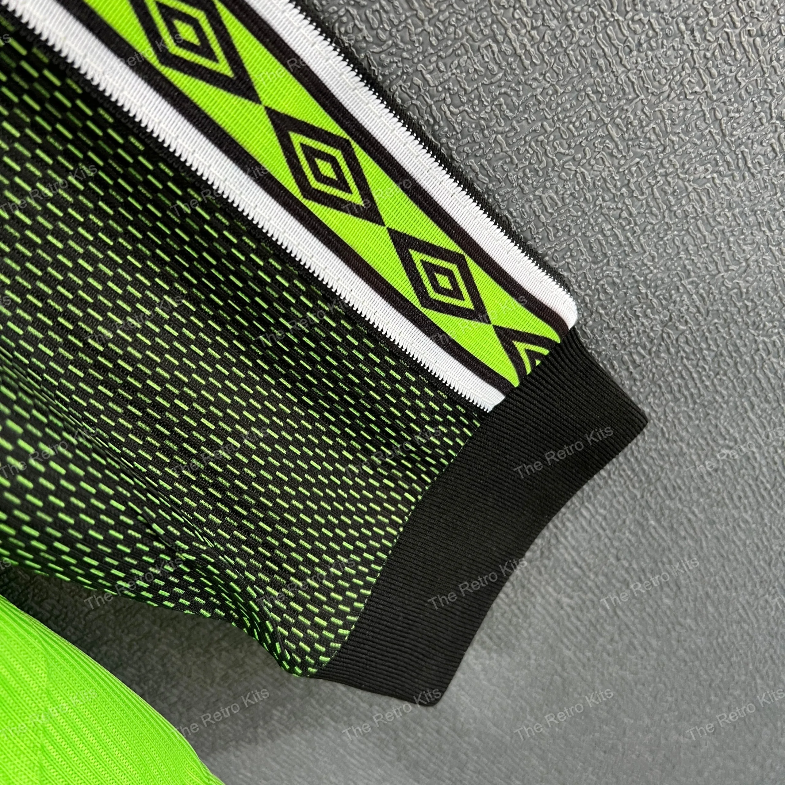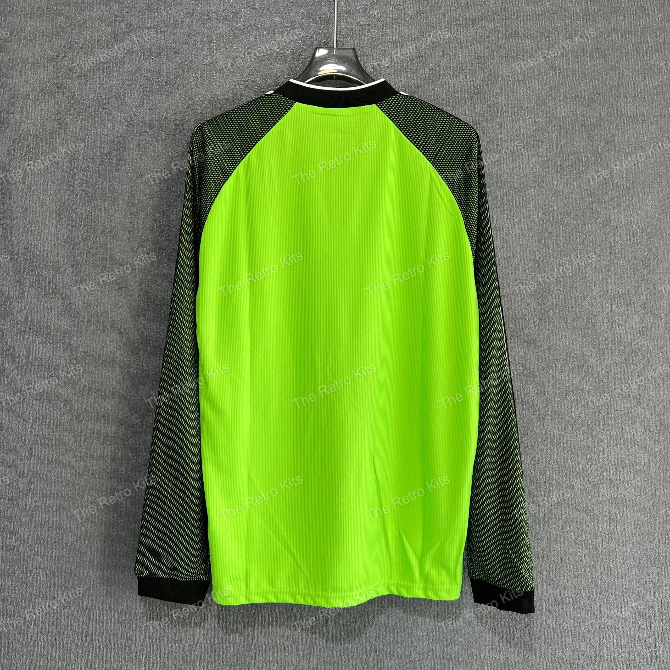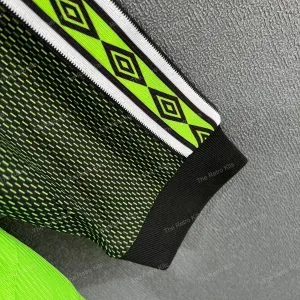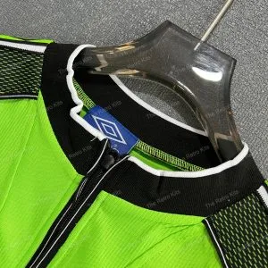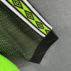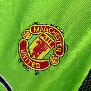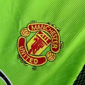The 1998/99 Manchester United goalkeeper shirt featured a striking green and black patterned design, paired with the Sharp sponsor across the chest. Worn by Peter Schmeichel during his final season at the club, this kit became iconic as United won the historic treble of Premier League, FA Cup, and UEFA Champions League, with Schmeichel captaining the side in the Champions League final in Barcelona.