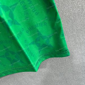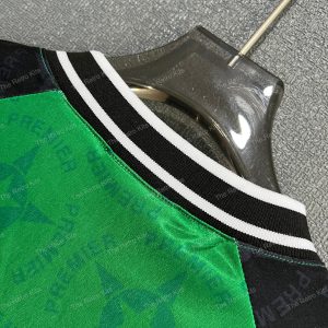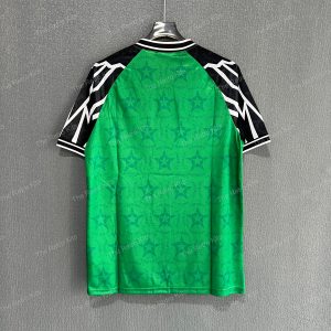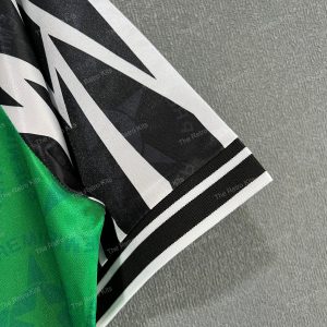 The 1994/95 Nigeria home shirt featured a vibrant green base with subtle star patterns across the body and bold black-and-white geometric sleeves, creating one of the most iconic designs in African football history. It displayed the Nigeria team crest and “NIGERIA” lettering across the chest, paired with a classic V-neck collar and striped trim.