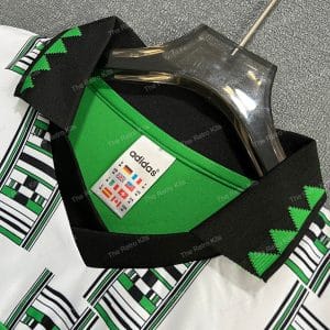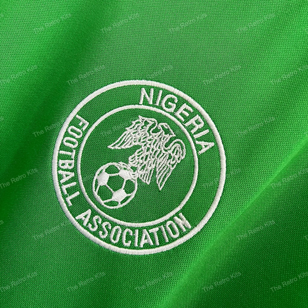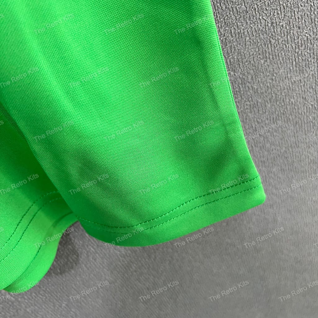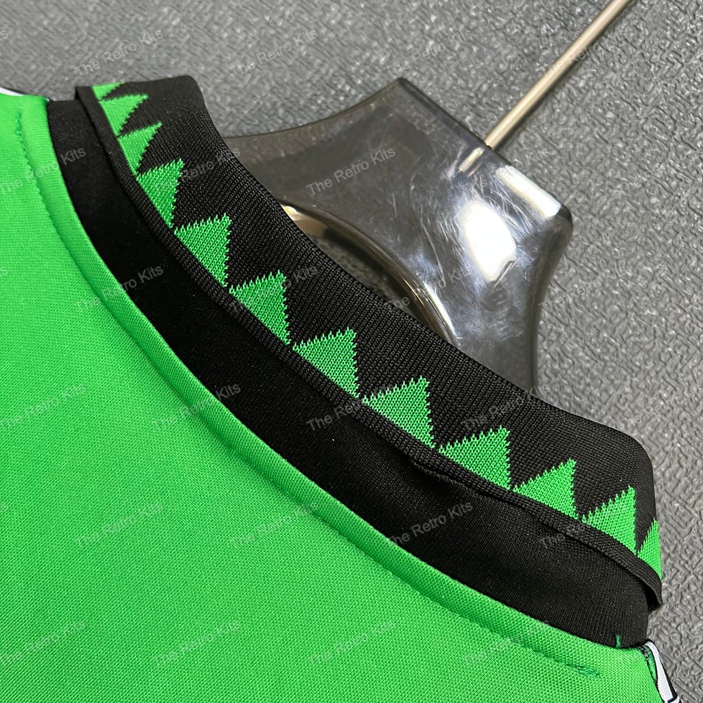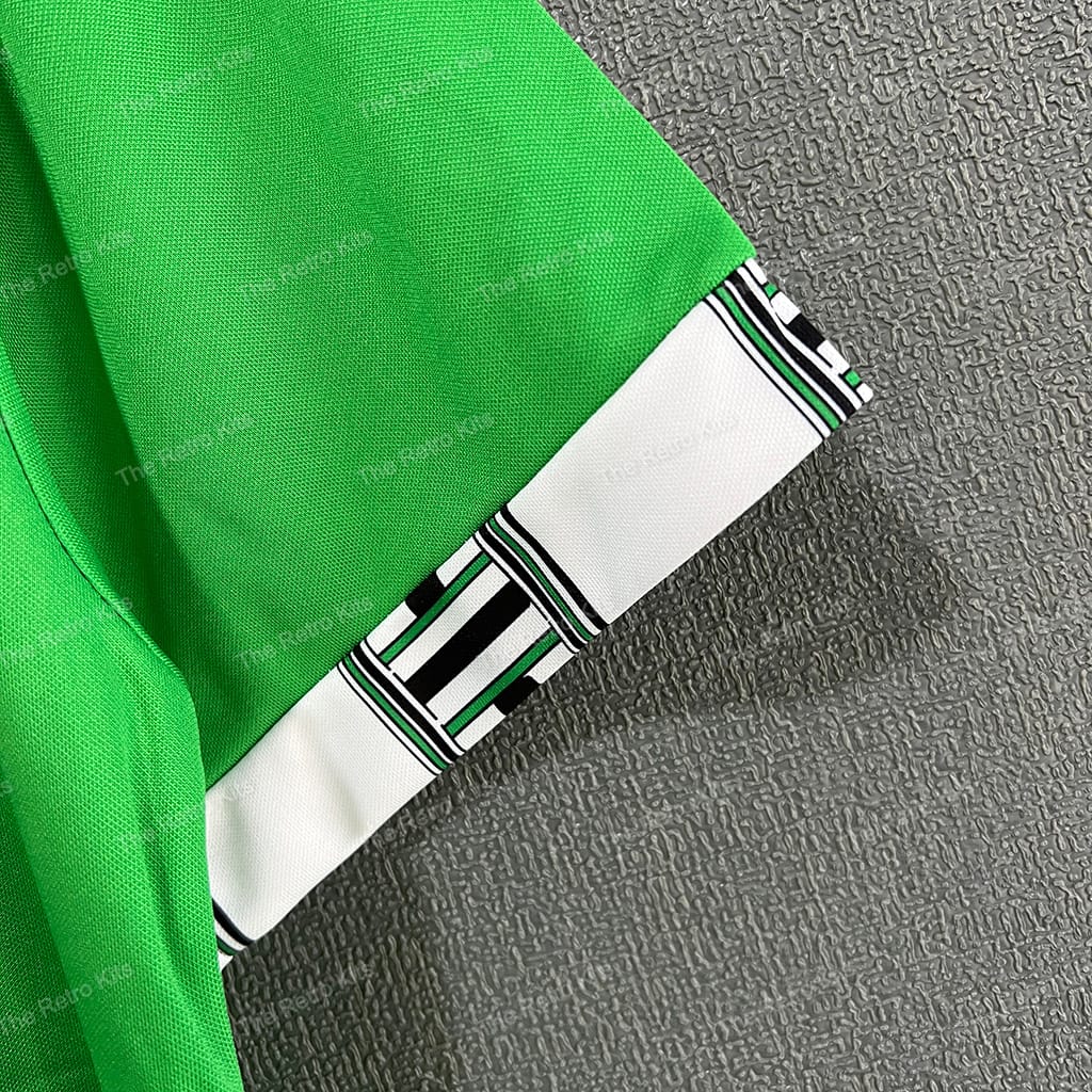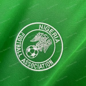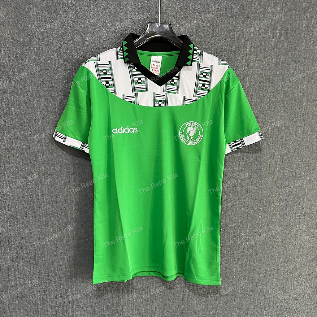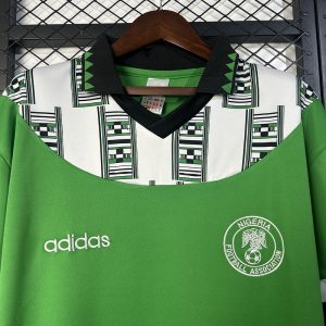 The 1994 Nigeria home shirt featured a vibrant green design with bold black-and-white patterned sleeves and a classic V-neck collar, paired with green shorts and socks. Subtle star motifs covered the body, symbolizing national pride and unity. It proudly displayed the Nigeria crest and “NIGERIA” text across the chest, standing out as one of the most memorable kits in African football history.