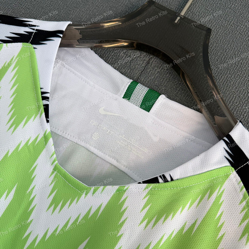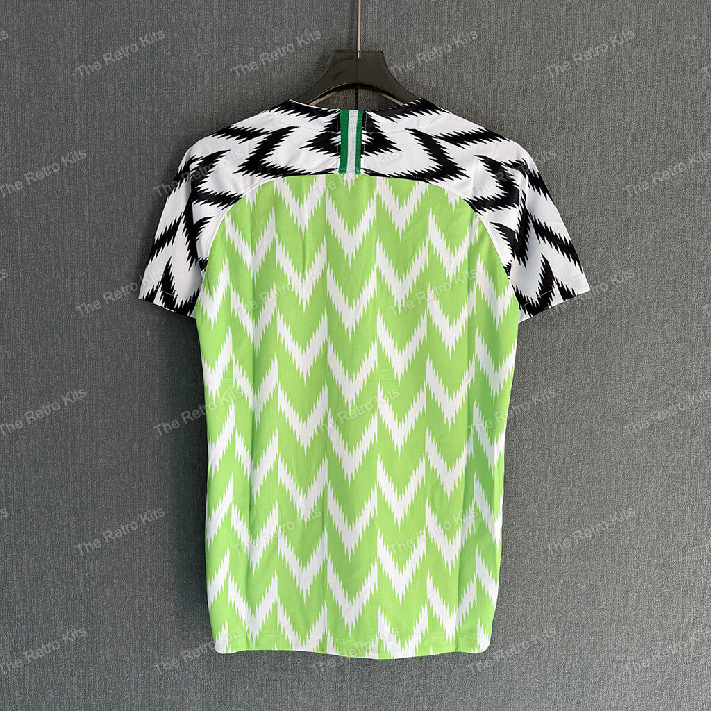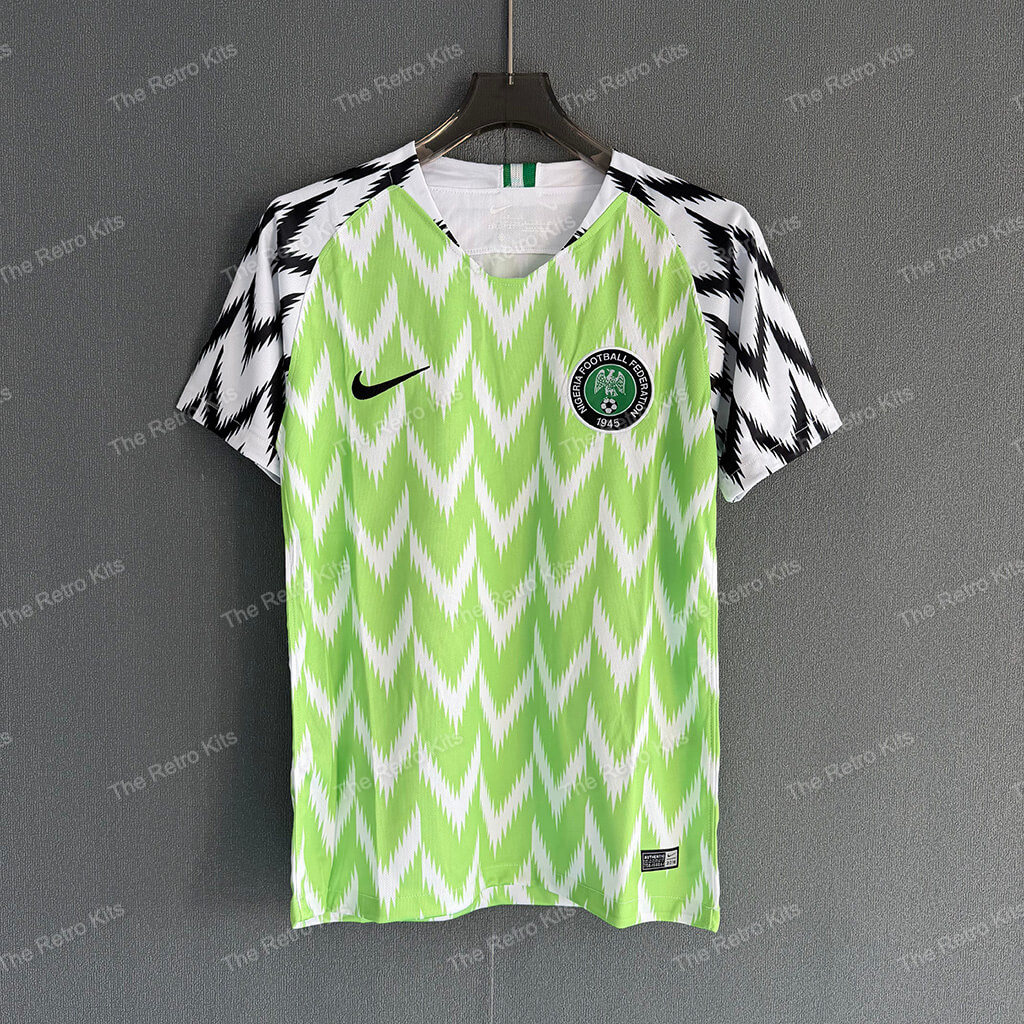 The 2018 Nigeria home shirt became an instant classic with its striking zig-zag pattern in green, white, and black. It combined a modern look with retro inspiration from the 1994 design. Paired with white shorts and green socks, it symbolized energy, pride, and creativity. Worn by players such as Alex Iwobi, John Obi Mikel, and Ahmed Musa at the 2018 FIFA World Cup, it was hailed worldwide as one of the most stylish kits ever made.