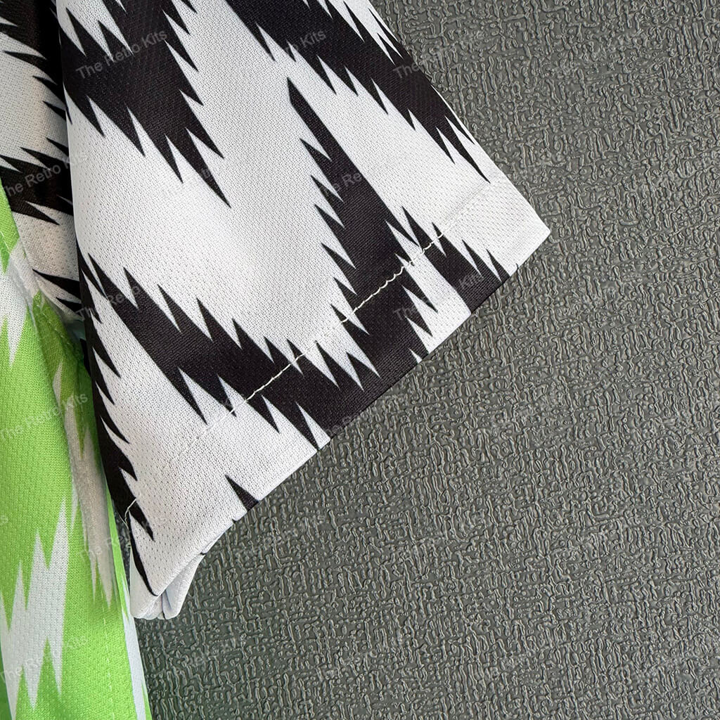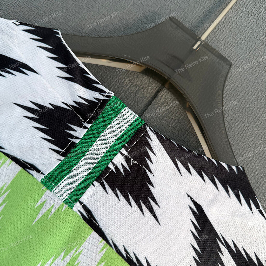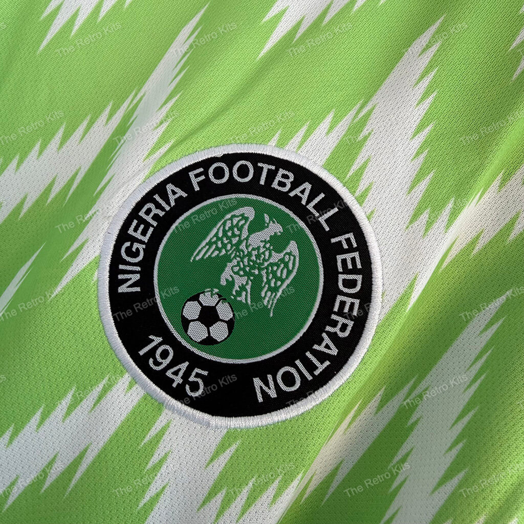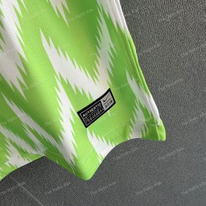 The 2018 Nigeria home shirt became an instant classic with its striking zig-zag pattern in green, white, and black. It combined a modern look with retro inspiration from the 1994 design. Paired with white shorts and green socks, it symbolized energy, pride, and creativity. Worn by players such as Alex Iwobi, John Obi Mikel, and Ahmed Musa at the 2018 FIFA World Cup, it was hailed worldwide as one of the most stylish kits ever made.