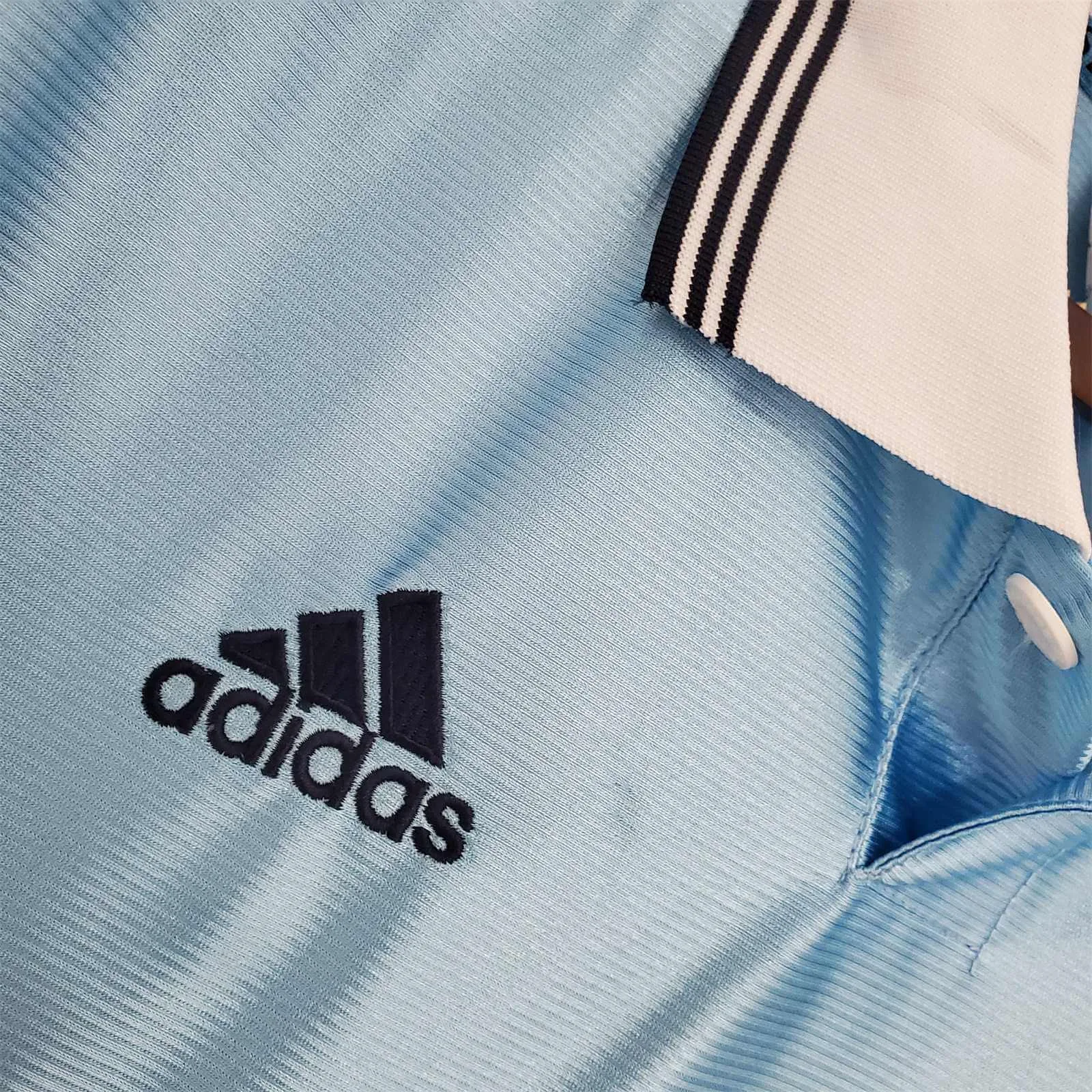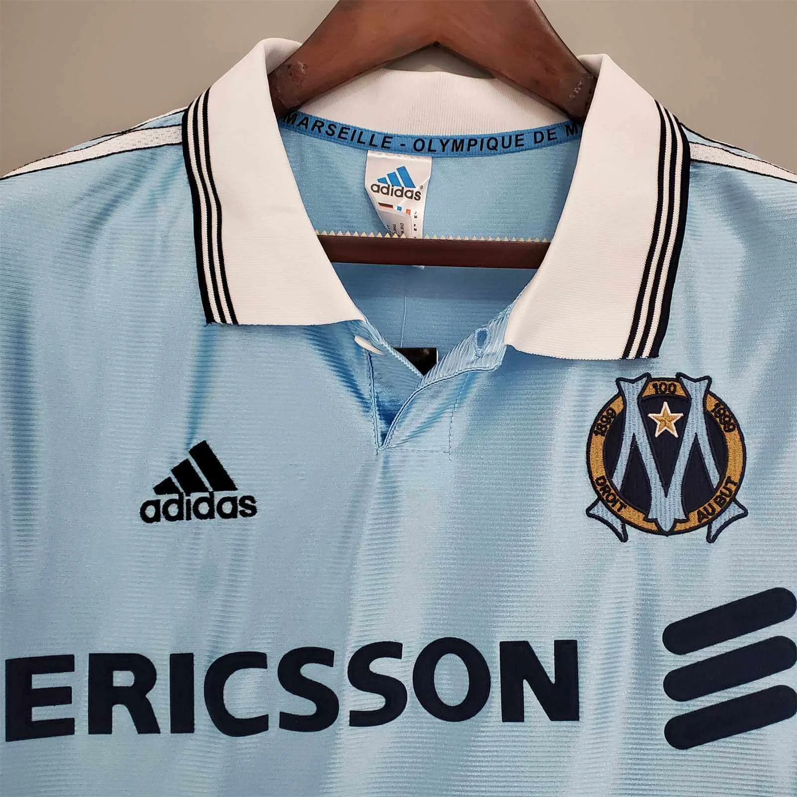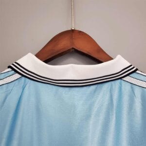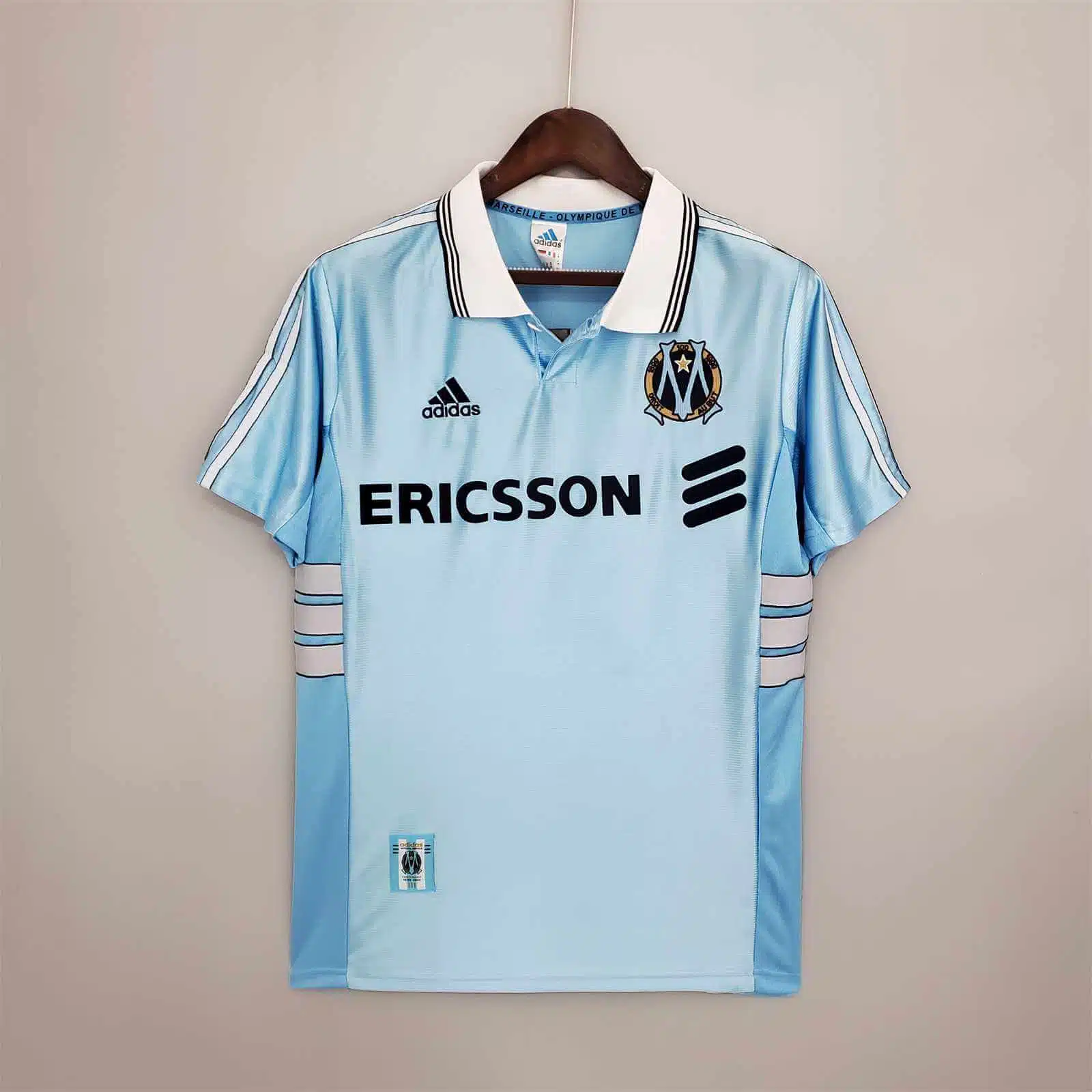 The 1998/99 Marseille away shirt featured a light blue design with white trim, proudly displaying the Ericsson sponsor across the chest. Worn by players such as Robert Pirès, Florian Maurice, and Laurent Blanc, this kit represented Marseille during a successful Ligue 1 season, as the team finished runners-up and secured qualification for the UEFA Cup.