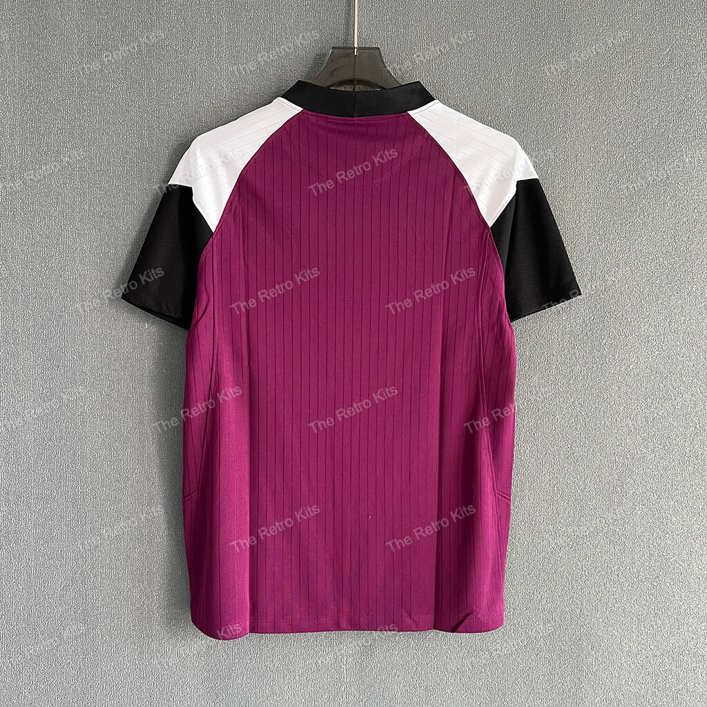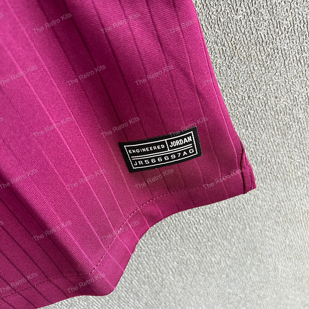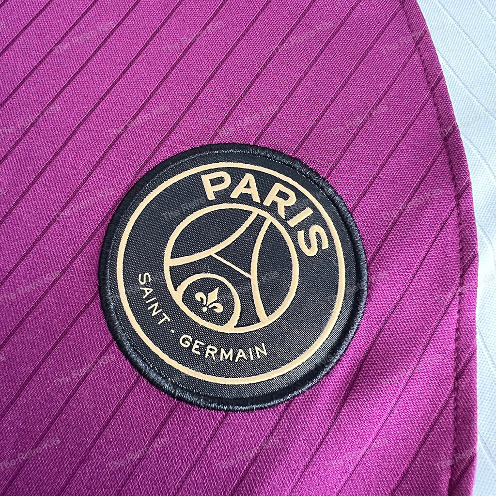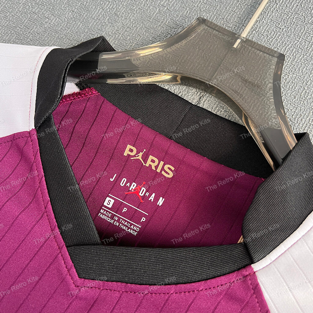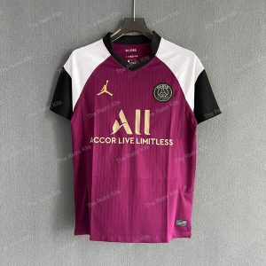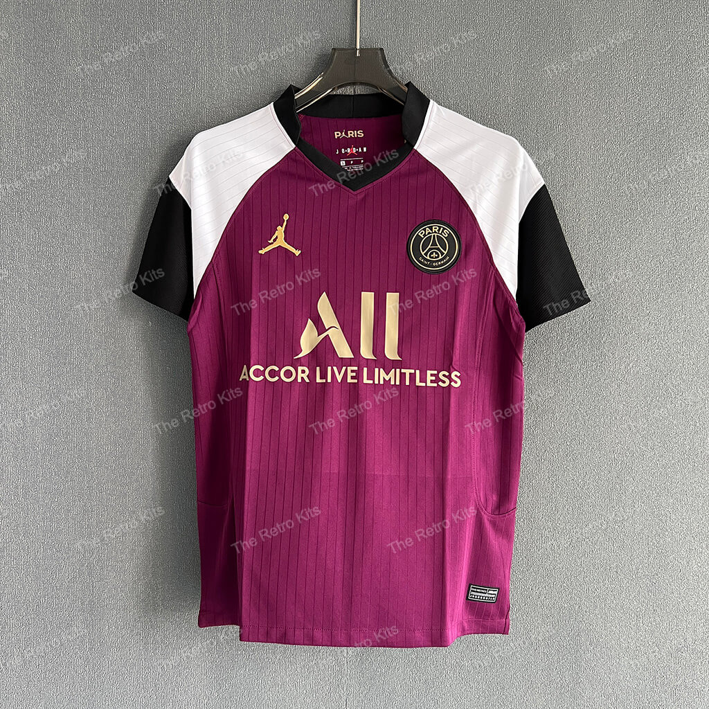 The 2020/2021 Paris Saint-Germain fourth shirt featured a bold black design with pink and purple gradient details, inspired by the Air Jordan “Space Hippie” collection. Paired with black shorts and socks, it carried the Jordan Jumpman logo and the All Accor Live Limitless sponsor across the chest. Worn by stars such as Kylian Mbappé, Neymar Jr., and Ángel Di María, this kit stood out for its streetwear influence and modern flair, blending PSG’s luxury style with the global appeal of the Jordan brand.
