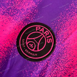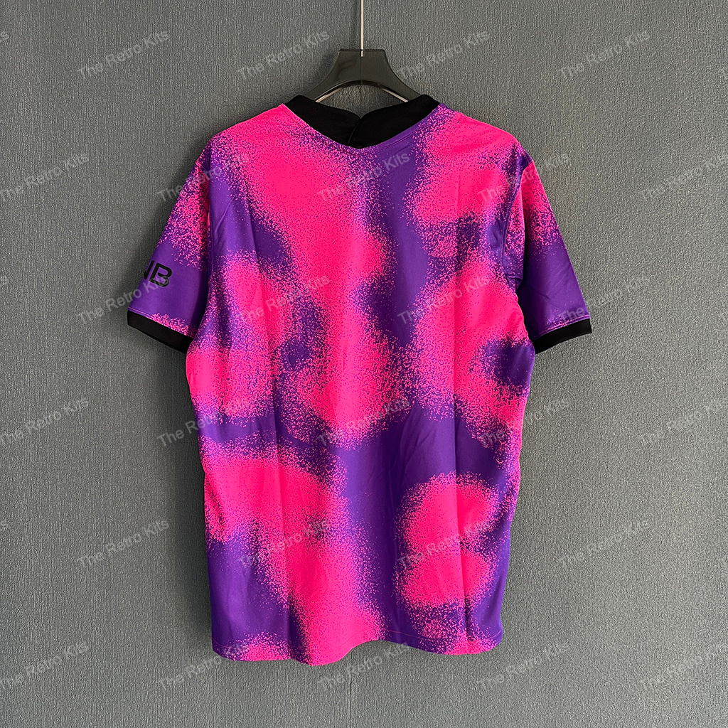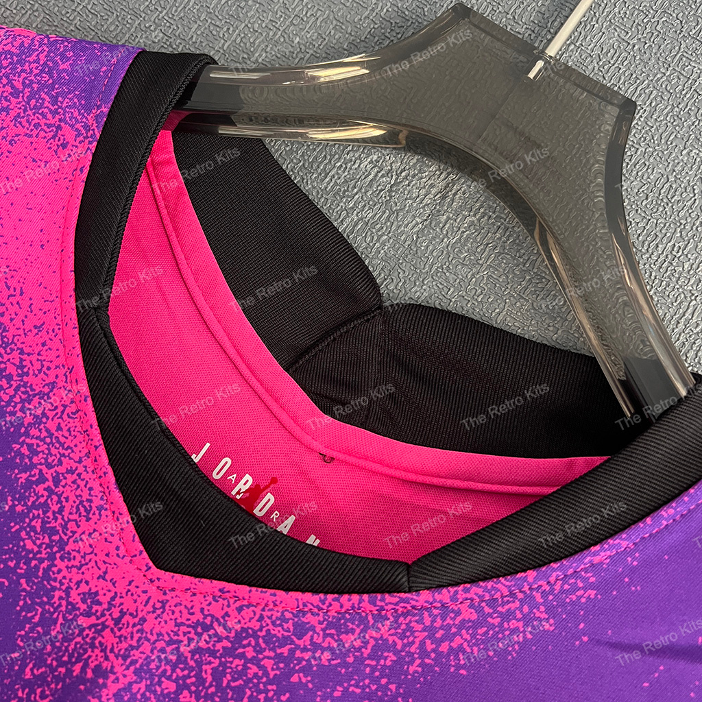 The 2020/2021 Paris Saint-Germain fourth shirt featured a bold black design with pink and purple gradient details, inspired by the Air Jordan “Space Hippie” collection. Paired with black shorts and socks, it carried the Jordan Jumpman logo and the All Accor Live Limitless sponsor across the chest. Worn by stars such as Kylian Mbappé, Neymar Jr., and Ángel Di María, this kit stood out for its streetwear influence and modern flair, blending PSG’s luxury style with the global appeal of the Jordan brand.