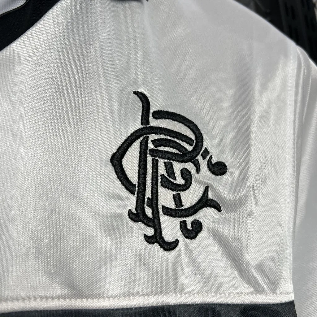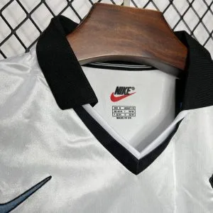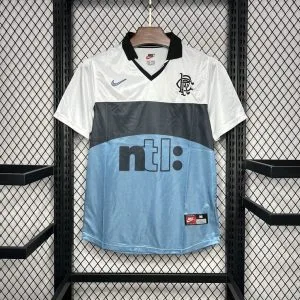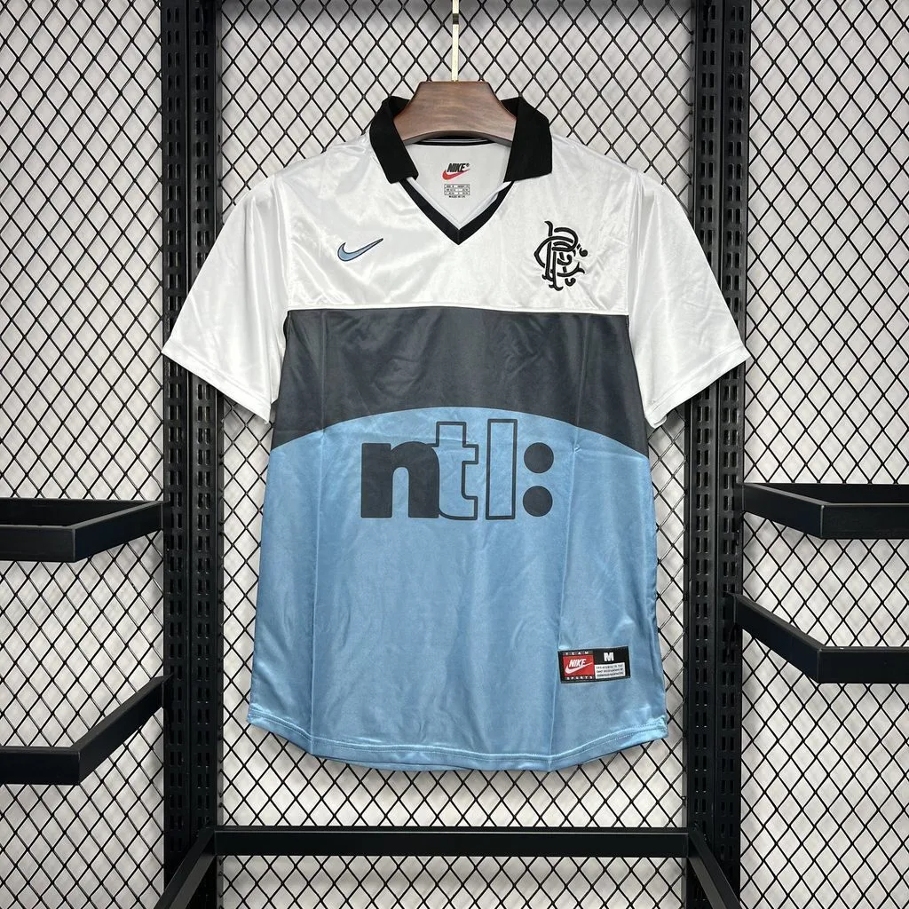 The 1999/2000 Rangers FC away shirt featured a bold orange design with navy blue details on the collar and sleeves, paired with navy shorts and orange socks. It displayed the NTL sponsor across the chest alongside the club crest, creating one of the most distinctive and memorable alternate kits in the club’s history. Worn by stars such as Giovanni van Bronckhorst, Jörg Albertz, and Andrei Kanchelskis, this shirt became an iconic symbol of late-90s Rangers, combining confidence, colour, and dominance in Scottish football.