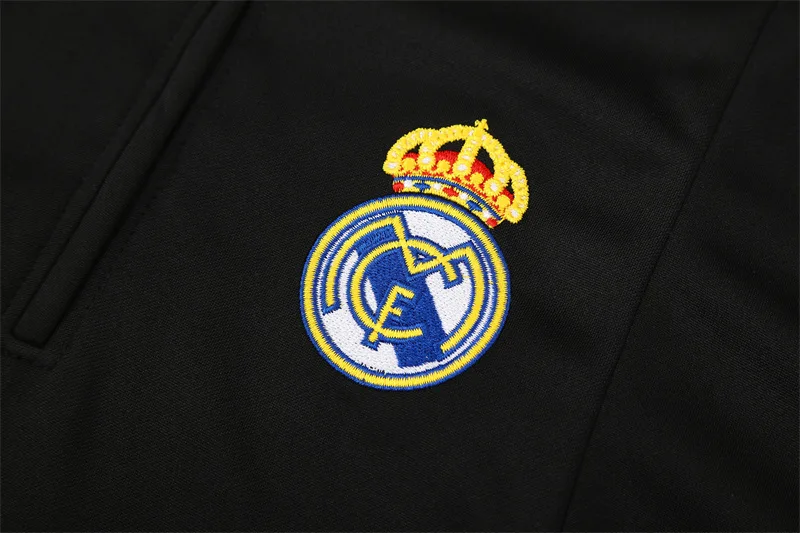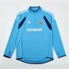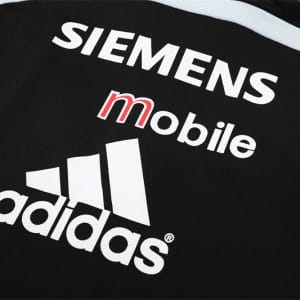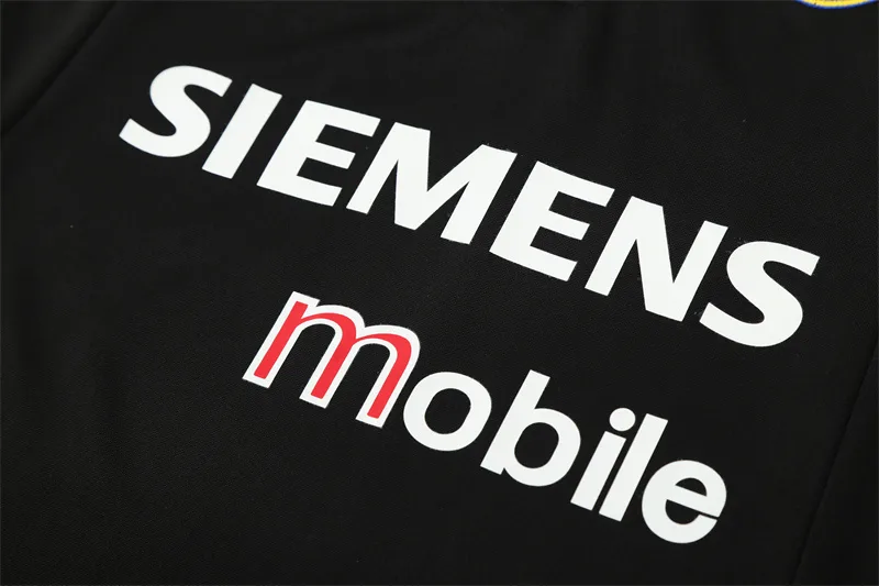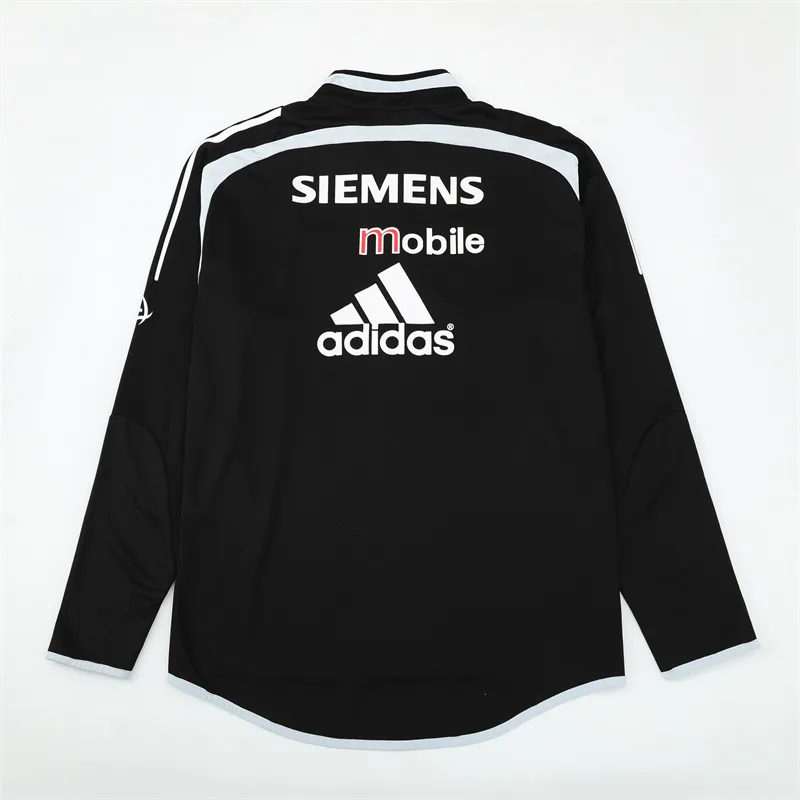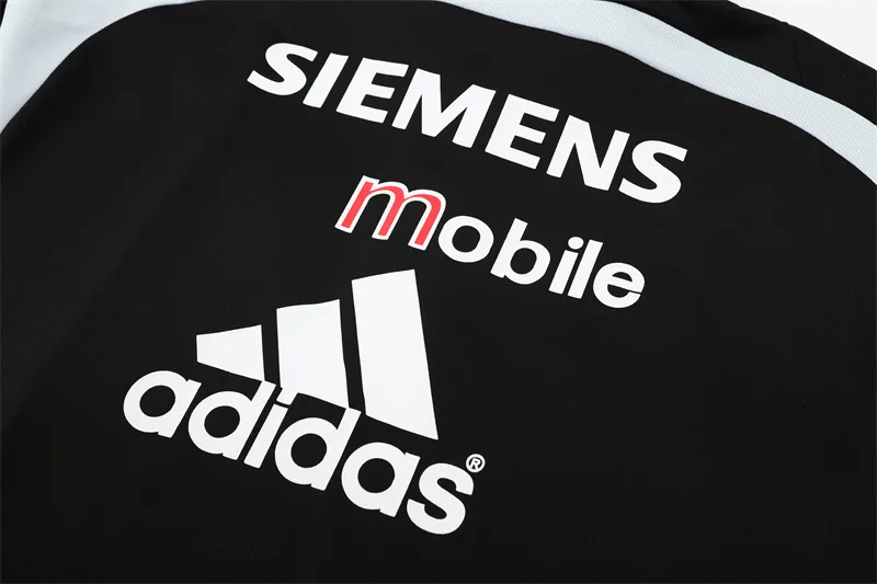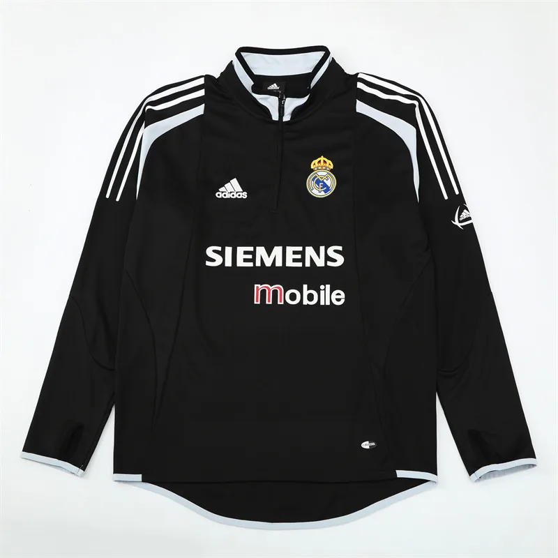 The 2004/05 Real Madrid black training suit featured a sleek all-black design with white detailing on the shoulders and sleeves, paired with matching black pants. It carried the Siemens Mobile sponsor across the chest alongside the club crest, giving it a bold and professional look. Worn by legends such as Zinedine Zidane, Ronaldo Nazário, and David Beckham, this suit belonged to the Galácticos era, during a season of high-profile stars and international appeal.