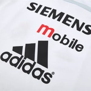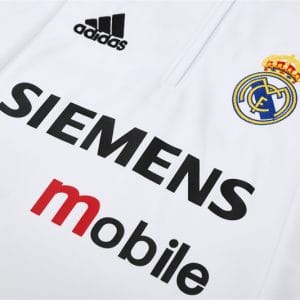 The 2004/05 Real Madrid white training suit featured a classic all-white design with black detailing on the shoulders and sleeves, paired with white pants. It also displayed the Siemens Mobile sponsor across the chest alongside the club crest, reinforcing the club’s traditional identity. Seen on icons like Roberto Carlos, Zidane, and Beckham, this training suit remains one of the standout looks of the Galácticos era.