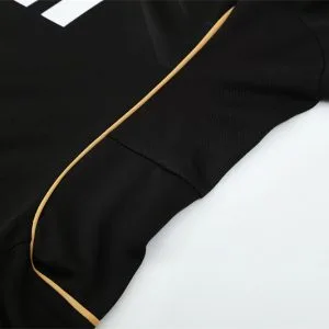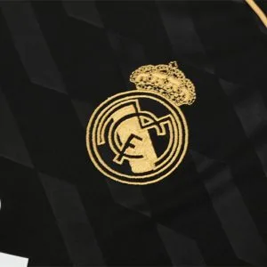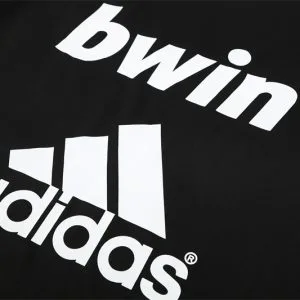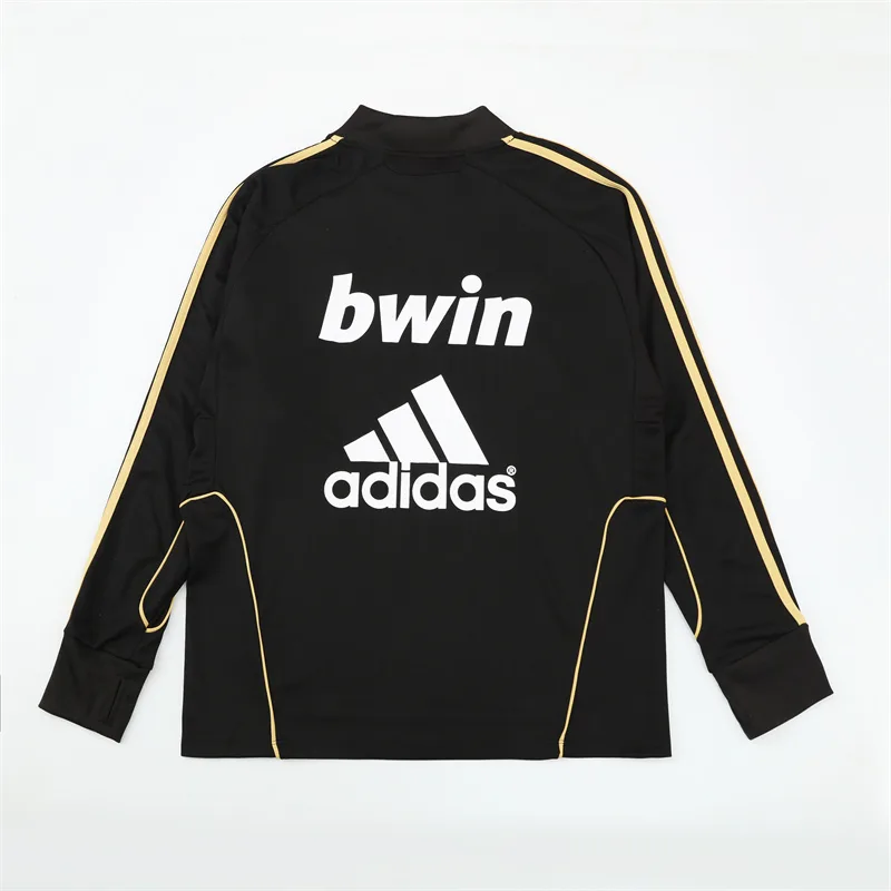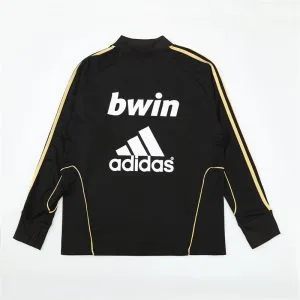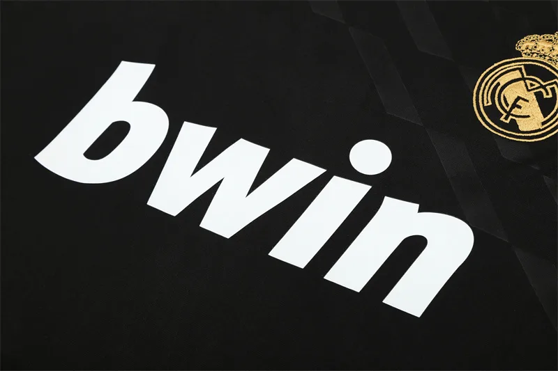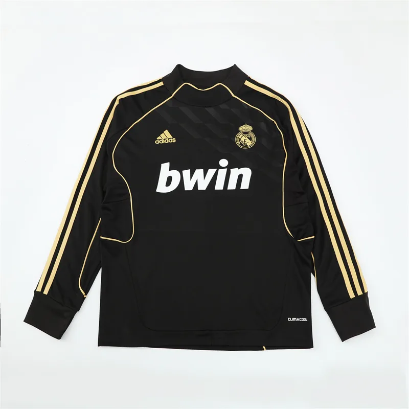 The 2011/12 Real Madrid black training suit featured a sleek black design with lime green detailing on the shoulders and sleeves, paired with matching black training pants. It displayed the bwin sponsor across the chest alongside the club crest, giving it a sharp modern look. Worn by players such as Cristiano Ronaldo, Mesut Özil, and Sergio Ramos, this suit is remembered from the record-breaking season when Real Madrid won La Liga with 100 points and 121 goals under José Mourinho.